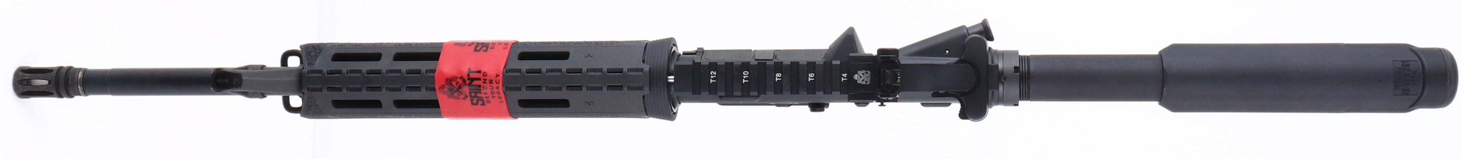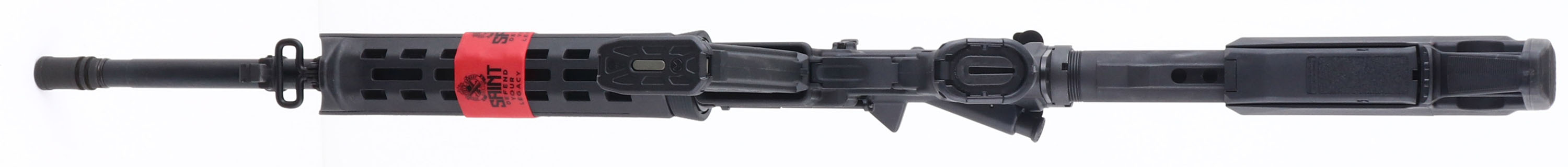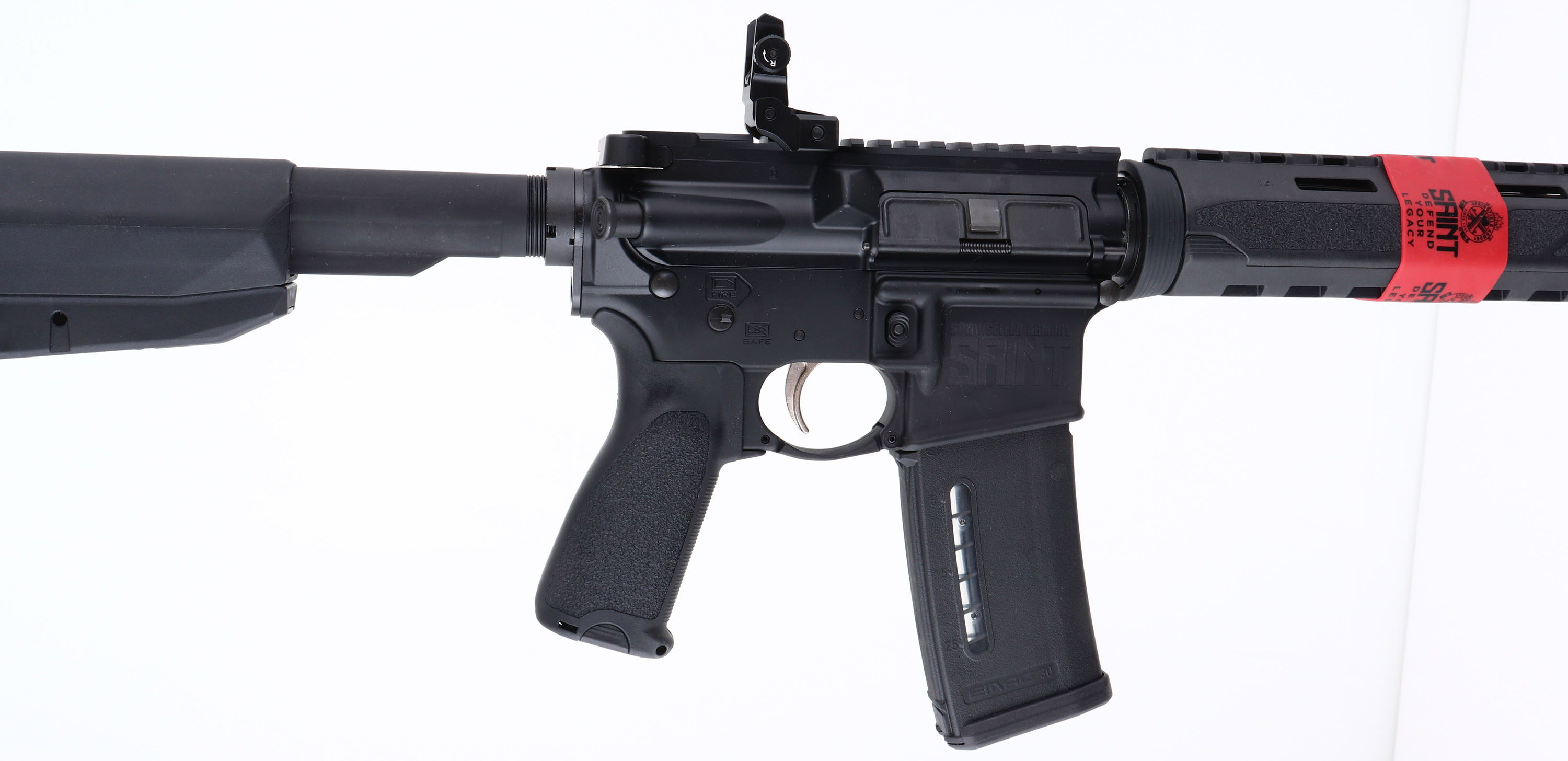 NEW, Springfield Armory, Model ''Saint'', CAL: 5.56, MFG: Modern, SN: 422829, Semi Auto Rifle, 18'' barrel. The multi-point adjustable stock, textured pistol grip & forend are excellent. The factory matte black finish rates 99%+. Bore is excellent. The receiver holds a flip-up dual folding disc rear peep sight & the barrel holds a tall winged blade front sight. Comes with factory SPA Saint red forend band. No box. NOS. FFL Req. - Value: 700 to 1200