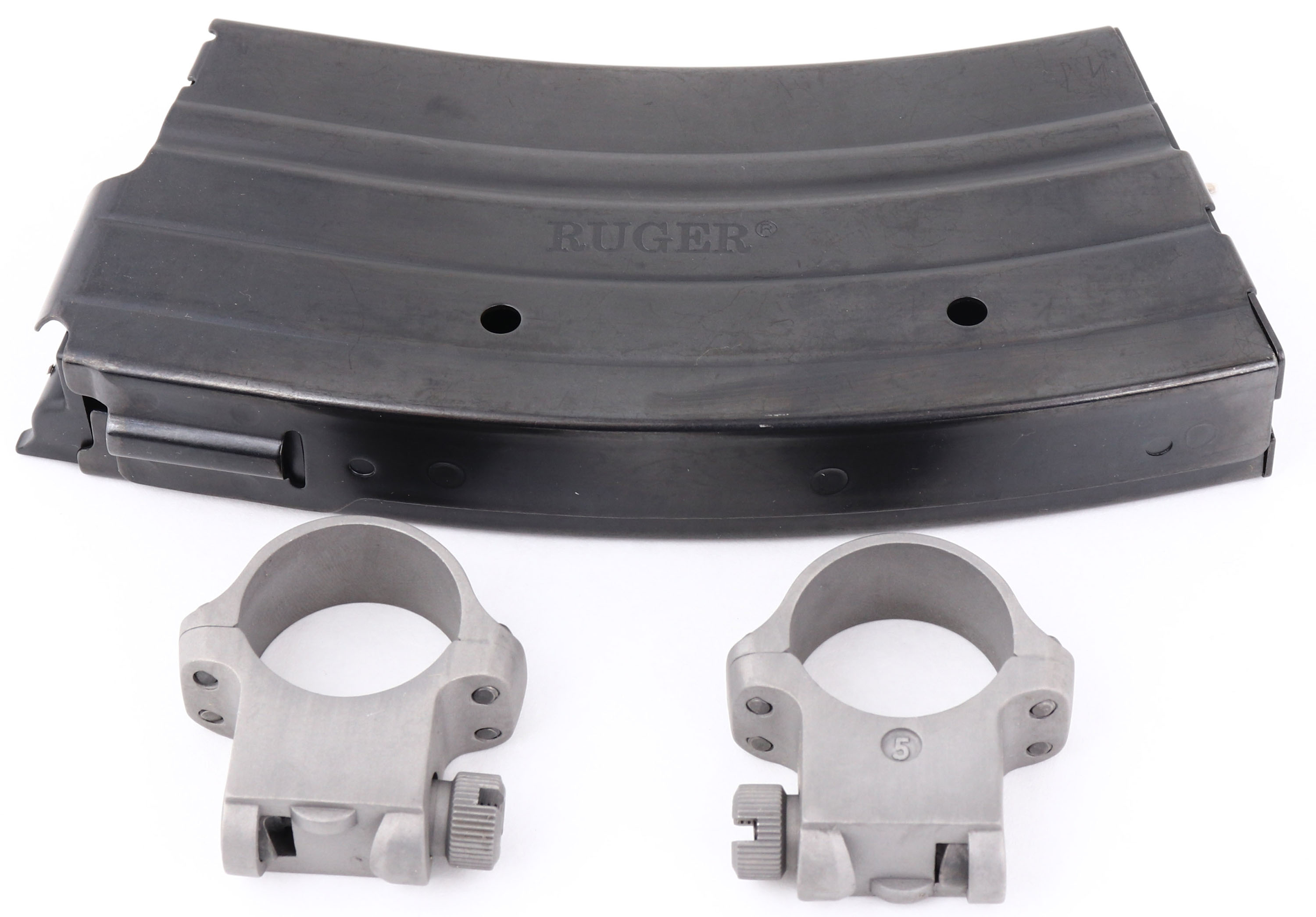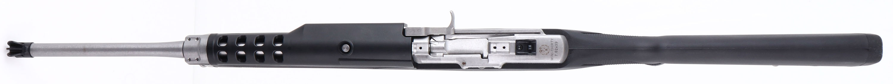 NEW, BOXED, Ruger, Mini-30, CAL: 7.62x39, MFG: Modern, SN: 584-72582, Semi Auto Rifle, 18 1/2'' barrel. The checkered & capped synthetic stock, with heat shield is excellent. The matte stainless steel finish on the barrel & receiver is excellent. Bore is excellent, unfired outside factory test. The receiver holds an adjustable rear peep sight & the barrel holds a banded winged blade front sight. The receiver is also tapped & drilled for mounting the included picatinny rail & scope rings. Stock carries a grooved hard rubber kickpad. Comes in factory box, with owners manual, (2) mags, scope rings, picatinny rail & lock. NOS. FFL Req. - Value: 800 to 1400