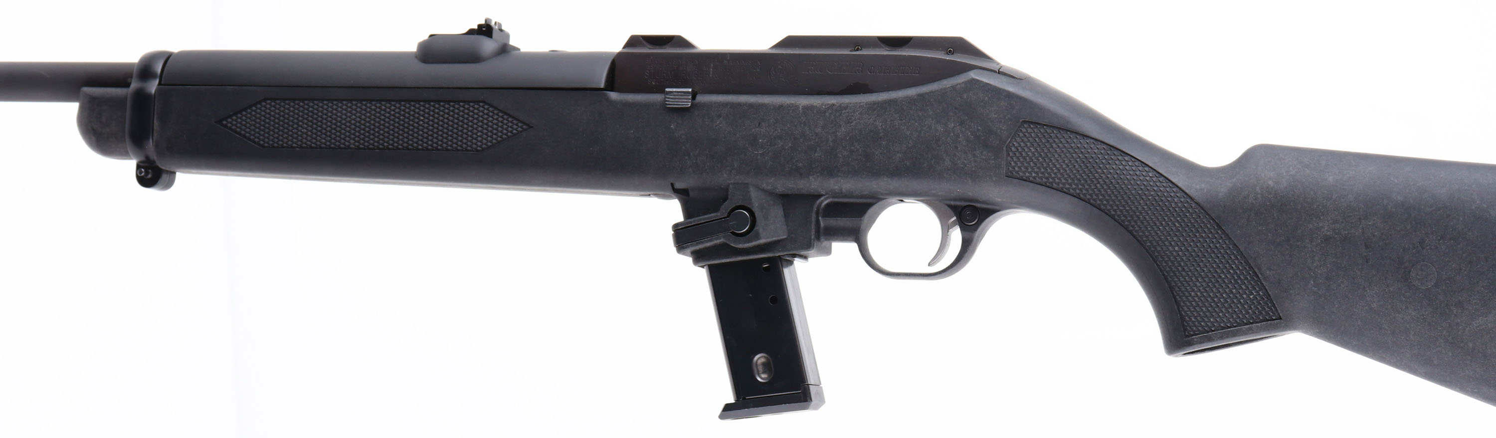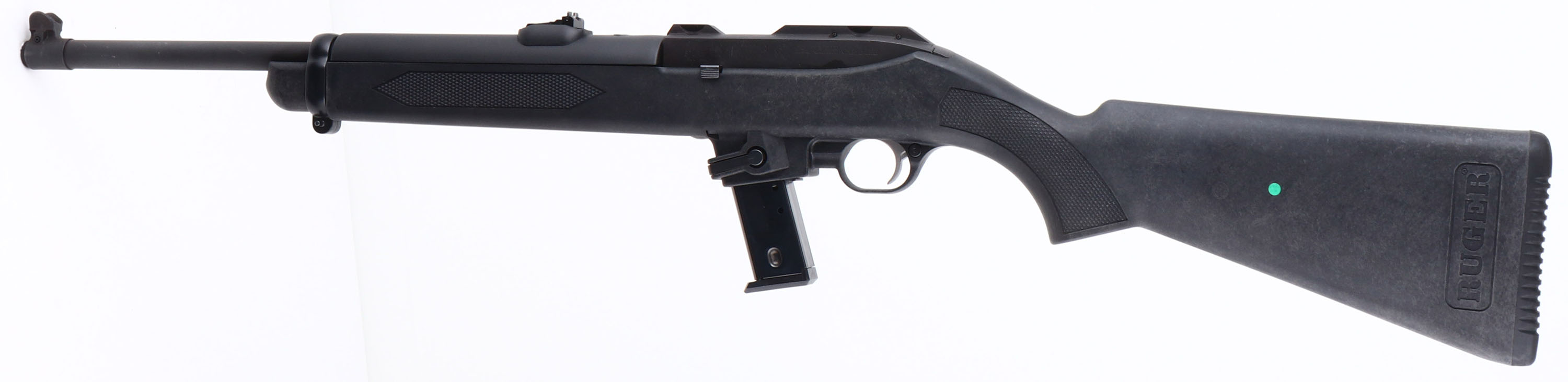 BOXED Ruger, Model PC4 Carbine Rifle, CAL: .40 AUTO (40 S&W), MFG: Modern, SN: 480-02740, Semi-Auto Rifle, 16'' Round barrel. The factory, checkered, pistol grip synthetic stock is excellent. The factory metal finishes are excellent. Factory rubber buttpad. Two Ruger marked detachable mags. Bore is excellent. Receiver carries a factory adjustable folding ghost ring aperture rear sight & a non-glare, protected blade front sight. Basically a NIB & NOS carbine. FFL Req. - Value: 500 to 900