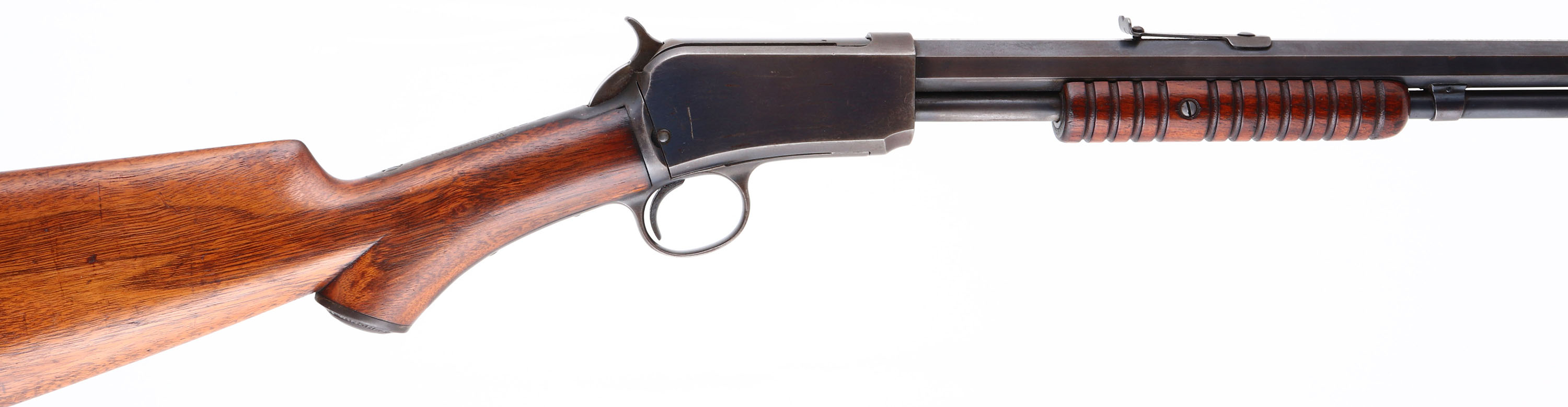 Winchester, Model 1890, 2nd variation, .22 WRF, Cal., MFG. 1903, SN: 177507, Pump Action Rifle, 24'' Octagon barrel. Special ordered WRF rifle, with letter confirmed ''Plain, Pistol grip stock''. The very unusual, non-checkered, capped pistol grip wood stocks are excellent, with very good original finish thinning at the carry points. There are minor handling marks, thin scratches & dings. The metal blue finish has 75% coverage of thinning & toning gray/brown finish. The rifle is fitted with standard adjustable rear & small blade front sights. Bore is good, with areas of pitting & roughness amongst strong rifling. Crescent metal buttplate. Smooth tight action. This is a rare & unusually configured collectible 1890 rifle.* FFL or C&R Req. - Value: 3000 to 4500
