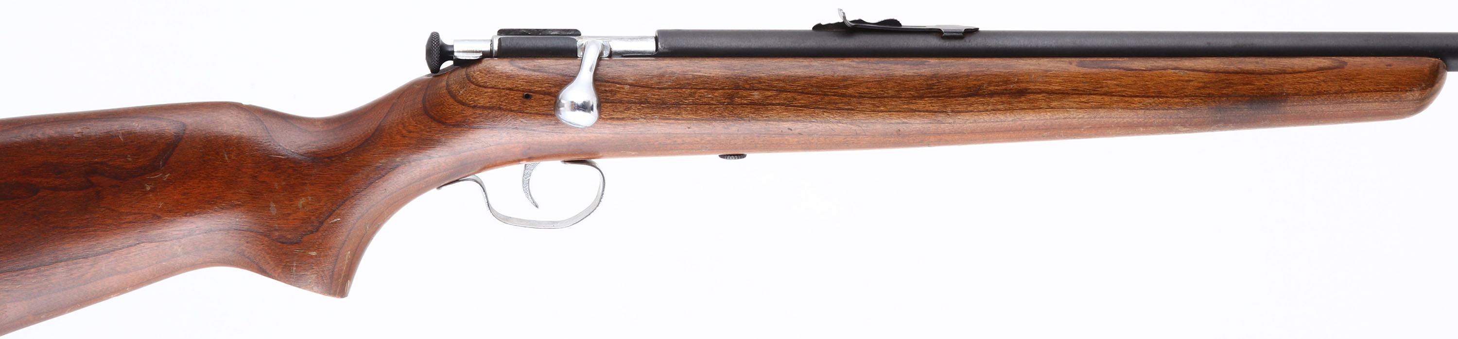Winchester, Model 67A, CAL: 22 S.L.LR, MFG: 1937-63, SN: NSN, Bolt Action Rifle, 27'' barrel. This rifle carries the later original flat pistol grip & tapered/slant forearm tip stock which is very good. It has multiple light scratches, scrapes & dings to the original finish. The metal blue finish rates 95% overall. Bore is excellent. The barrel holds an adjustable rear sight & blade front sight. Nickeled trigger, trigger guard & bolt handle. Original Winchester checkered plastic buttplate. FFL or C&R Req. - Value: 150 to 350