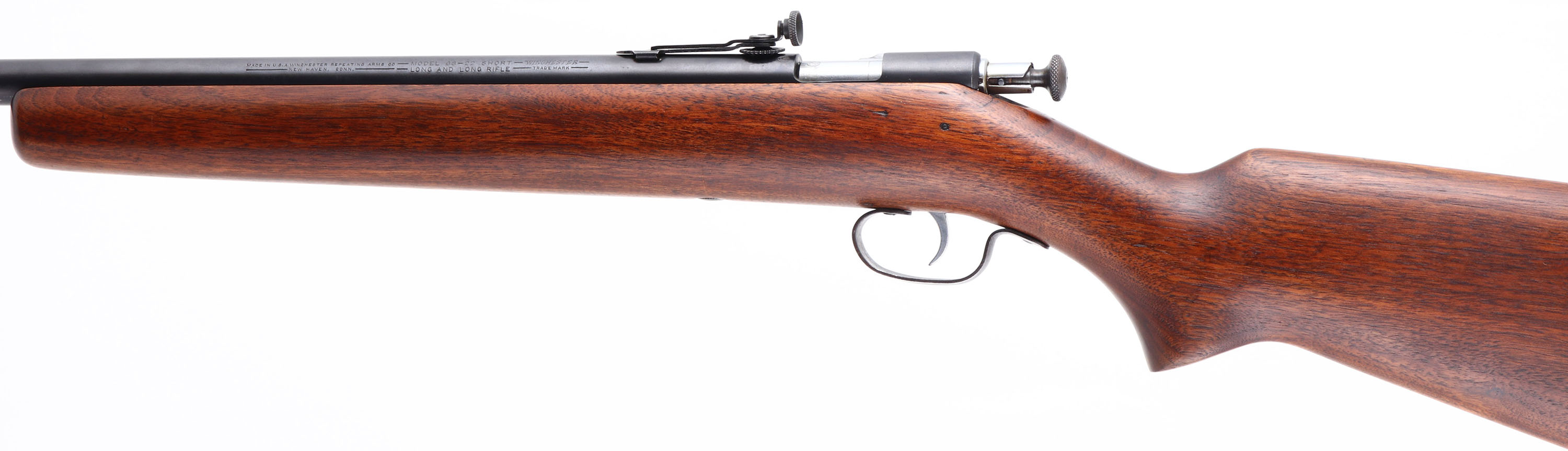 ARE!! Winchester, Model 68, 2nd Issue ''Junior Variation'', CAL: .22 S.L.LR, MFG: 1943, SN: NSN, Bolt Action Single Shot Rifle, 20'' barrel, Crowned Muzzle. Standard Model 68 rifles carried 27'' barrels, but in 1943 Winchester assembled some rifles with 20'' barrel giving it the ''Junior'' designation. The buttstock was also 1'' shorter on these rare Junior models. Although these special youth models were never advertised, or promoted, a limited number were produced making examples very desirable. This rifle has been professionally restored to factory standards. The factory flat pistol grip wood stock is excellent & solid, with very few minor handling marks. The metal blue finish rates 98% on barrel & thinning to 80% on trigger guard. Bore is excellent. The barrel holds the rare disc adjustable peep sight & a ramp elevated hooded front sight. Stock carries a Winchester checkered black plastic buttplate. A high condition example of a rare & very collectible .22 rifle. FFL or C&R Req. - Value: 800 to 1500