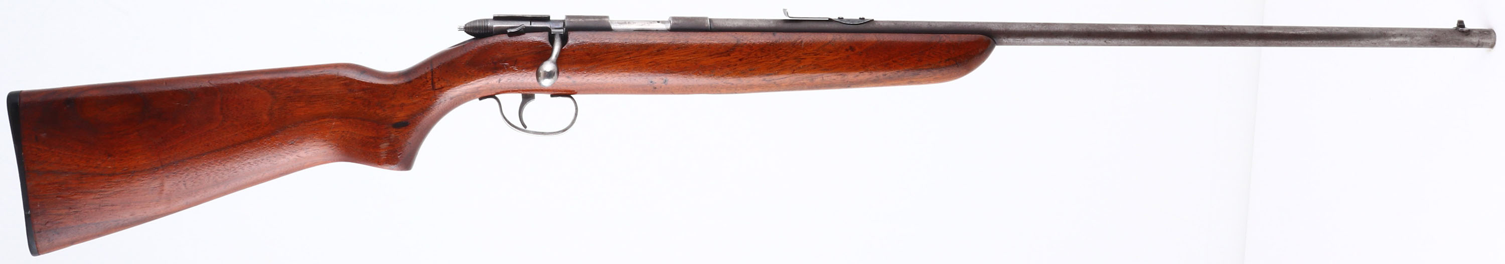 Remington, Model 510 Target Master, .22 S. L. or LR Cal., MFG. 1947, SN: None, Bolt Action Single Shot Rifle, 25'' round barrel. Original wood stock is good & solid, but with a 13'' glued tight crack from the trigger to the forend tip. There are numerous small scratches, contusions & scuffs under an added layer of finish. The metal blue finish has worn mostly gun metal gray with a thin brown finish. Bore is very good. Factory sights, with elevator missing on rear. Original buttplate has a 1'' crack. FFL & C&R Req. - Value: 100 to 200