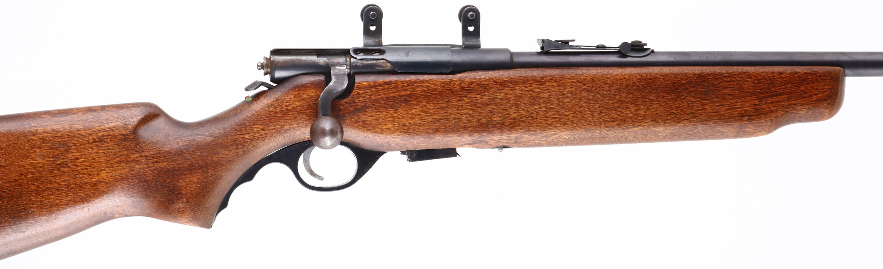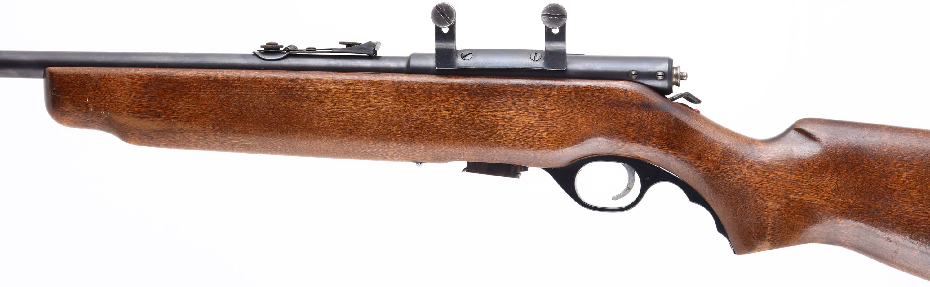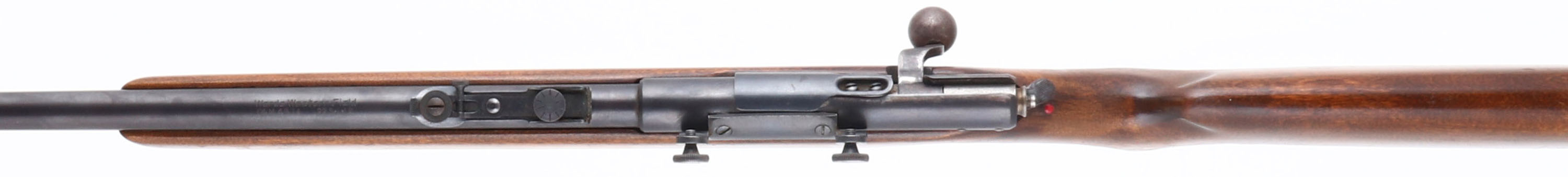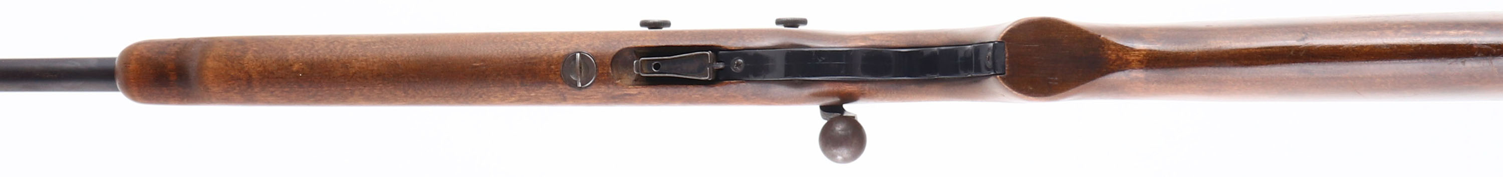 BOXED, Ward's Western Field, Model 04M 497A, CAL: 22 S.L.LR, MFG: Late 1930's, Early 1940's, SN: NSN, Bolt Action Rifle, 24'' barrel. The original flat pistol grip wood stock is excellent. There are minor scrapes, dings & small areas of thinning or flaking to the original finish. The metal blue finish rates 95% overall, beginning to tone to a brown patina. Bore is excellent. The receiver holds a side-mounted scope base. Included is a factory scope, held by a Wards Model 20 base, but the scope does not appear to attach to the gun with the current hardware. The barrel holds a disc adjustable rear sight & hooded cone front sight. Grooved plastic buttplate. Comes in original box, with owners manual & other paper articles. FFL or C&R Req. - Value: 200 to 300