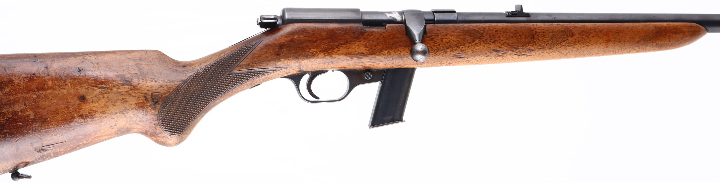 Walther, Model 2 Autoloader, CAL: 22 LR, MFG: 1930's, SN: 35092K, Bolt/Semi-Auto Rifle, 20 5/8'' barrel. This is a very unique rifle, which can function as either a semi-auto or a single shot bolt action depending on where the shooter leaves the bolt placement after cocking the initial round. The original checkered round knob wood stock is good & solid, with numerous scratches, scrapes & dings. The finish has worn thin & with flaking in large areas. The stock is solid, but shows extensive wear. The metal blue finish rates 90% on barrel & receiver, with small scuffs, scrapes & light speckling. The finish rates 50% on trigger guard & has toned to a brown patina. Bore is excellent. The barrel holds a three distance folding leaf rear sight & elevated bead front sight. Stock carries a Walther checkered black plastic buttplate. Sling loops present. Detachable mag. Not many people have seen or heard of these automatic carbines as they are seldom seen in the U.S. market. FFL or C&R Req. - Value: 300 to 600