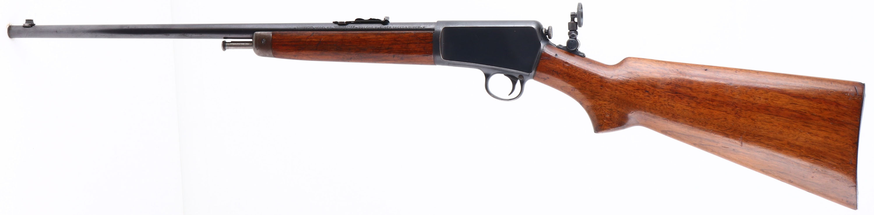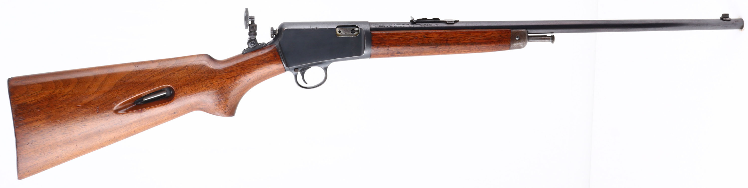 Winchester, Model 63 Carbine, .22 LONG R. SUPER SPEED & SUPER-X Cal., MFG: 1933, SN: 247, Semi-Auto Action Rifle, Likely a first week or first month production gun. Has the rarer early 20'' carbine length tapered round barrel. The 20'' barrels were discontinued in 1936 when the 23'' barrel length was implemented. The original factory flat pistol grip wood stocks are excellent & solid, despite numerous small blemishes, contusions, scratches & chips along the edge of the pistol grip & buttend. The stocks retain the majority of the original finish. The original metal blue finish is 95% on the barrel, 85% on the receiver, with areas of thinning loss toning a bit plum. Bore is excellent. Fitted with a large disk aperture tang sight, while barrel carries an adjustable rear & small blade front sight. Factory metal buttplate. A very nice & original early production semi-auto. FFL or C&R Req. - Value: 1200 to 2500