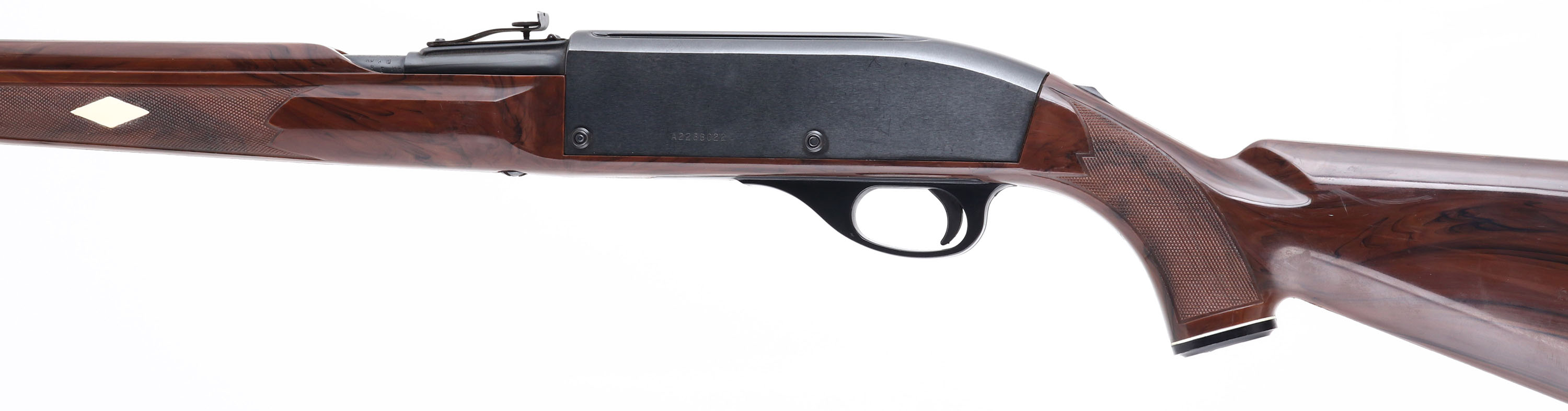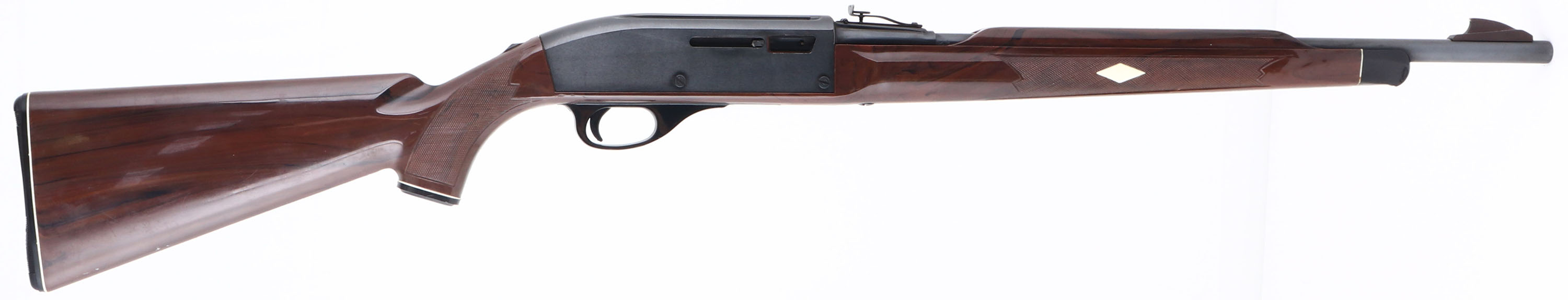Remington, Model 66 NYLON Mohawk Brown, .22 LR. ONLY Cal., MFG. 1983, SN: A2288022, Semi-Auto Rifle, 19 1/2'' round barrel, Tube fed. The original checkered & pistol grip brown synthetic, stock is excellent & solid, with minor scratches & scuffs. Metal retains 98% of original black finish on barrel & 95% on receiver. Barrel is a factory replacement, as it carries a different SN# & barrel carries factory repair codes. Factory front & rear sights. Bore is excellent. Loaded through a tube in the stock. The bolt cocking handle is broken off. A fun shooting rifle. FFL Req. - Value: 100 to 300