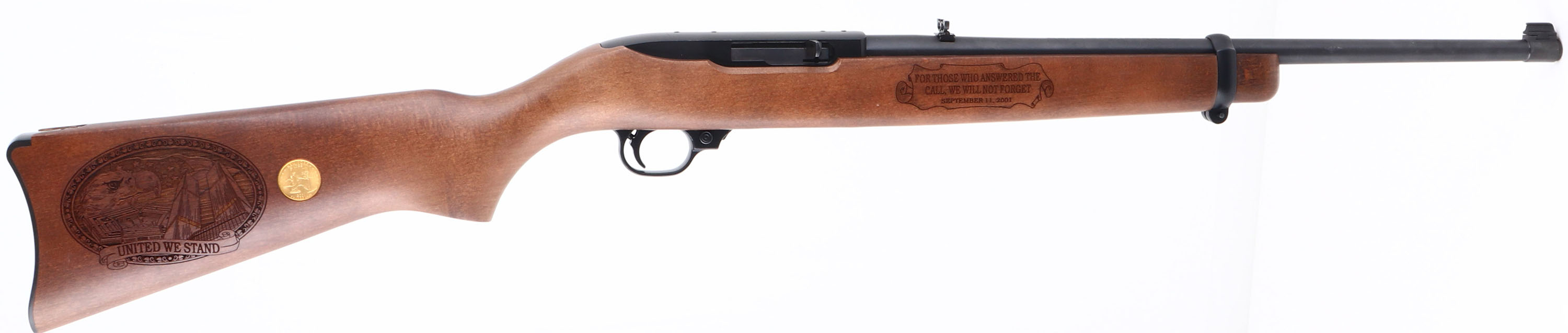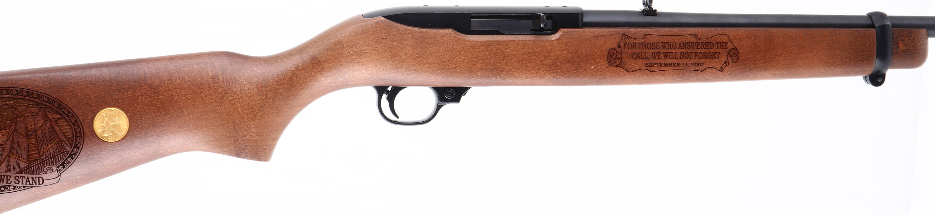 Ruger, Model 10/22 Carbine, Sept 11th Colorado Edition 303 of 500, CAL: 22 LR, MFG: 2001, SN: 253-00626, Semi-Auto Rifle, 18 1/2'' barrel. The original flat pistol grip wood stock is excellent, with excellent original finish. The stock carries laser engravings, with a New York State coin. The metal blue finish rates 99%. Bore is excellent, with defined rifling. The rifle is fitted with a folding leaf rear sight & elevated blade front sight. Buttstock carries a carbine style plastic buttplate. Missing detachable mag. FFL Req. - Value: 300 to 600