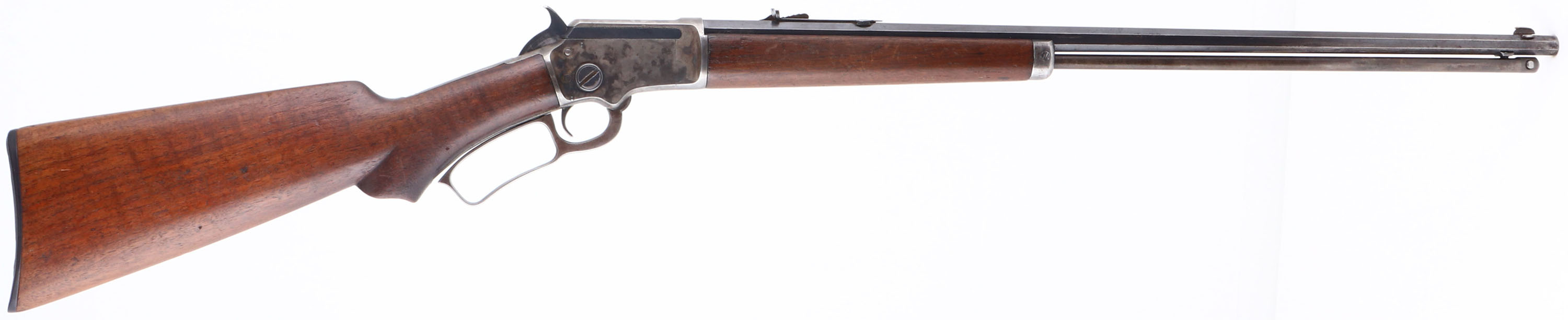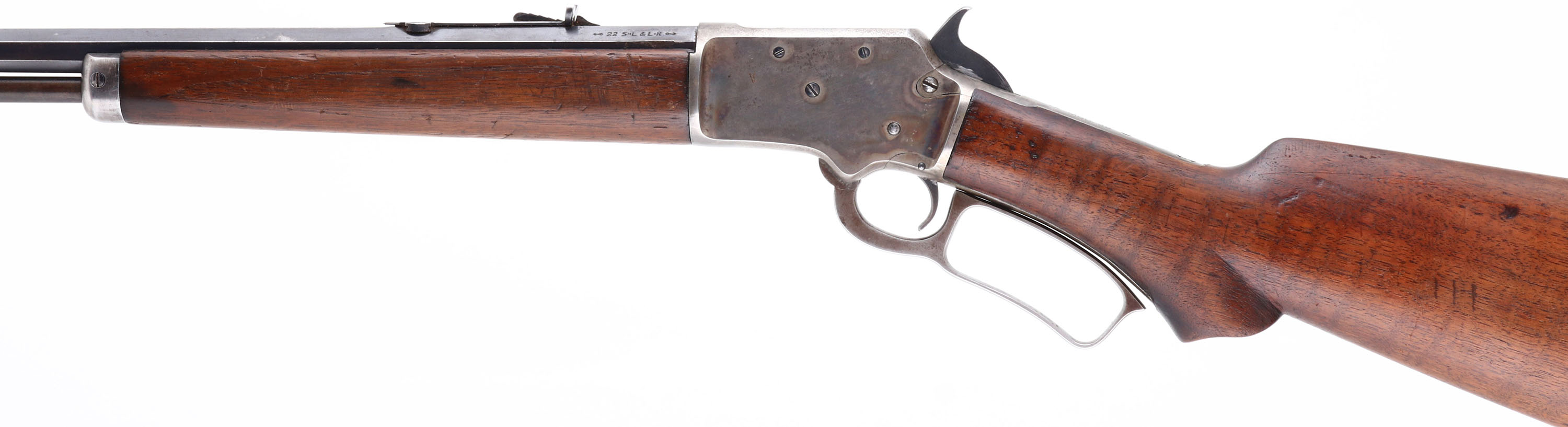 Marlin, Model 39, CAL: 22 S.L.LR, MFG: 1920's, SN: S6975, Lever Action Rifle, 24'' octagon barrel. The original scalloped pistol grip wood stocks are very good, as lightly sanded & refinished. There are contusions, scrapes, nicks & thinning to the finish. The trademark bullseye is present on the bottom belly of the stock. The original metal blue finish on the barrel rates 60%, toned to a thin brown patina in areas of loss. The tube has worn to a gun metal gray & brown patina. The receiver is case-hardened has worn & toned mostly gun metal gray, with shadowing & muted case-colors remaining. Bore is excellent & bright, with light intermittent spotting. The barrel holds an adjustable rear sight & blade front sight. The buttplate carries an accurate replacement of a Marlin checkered plastic buttplate. FFL or C&R Req. - Value: 500 to 1000