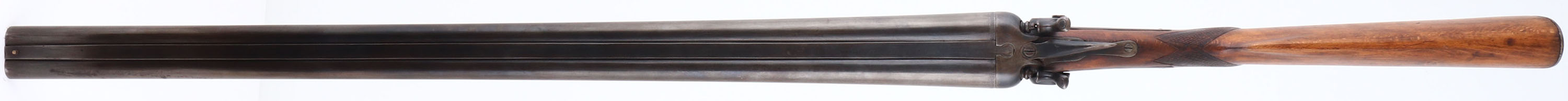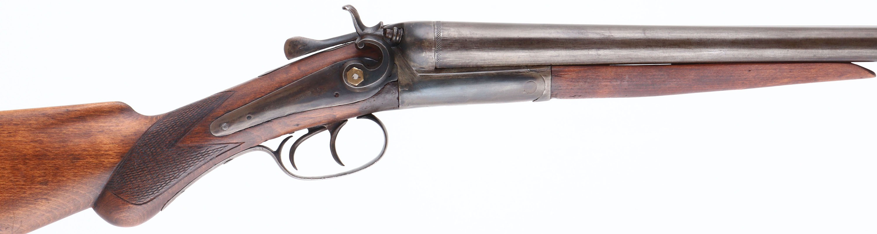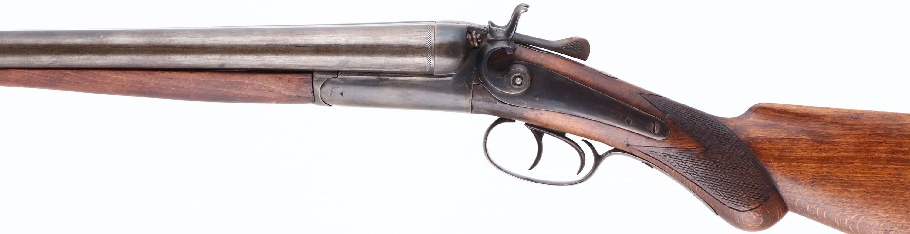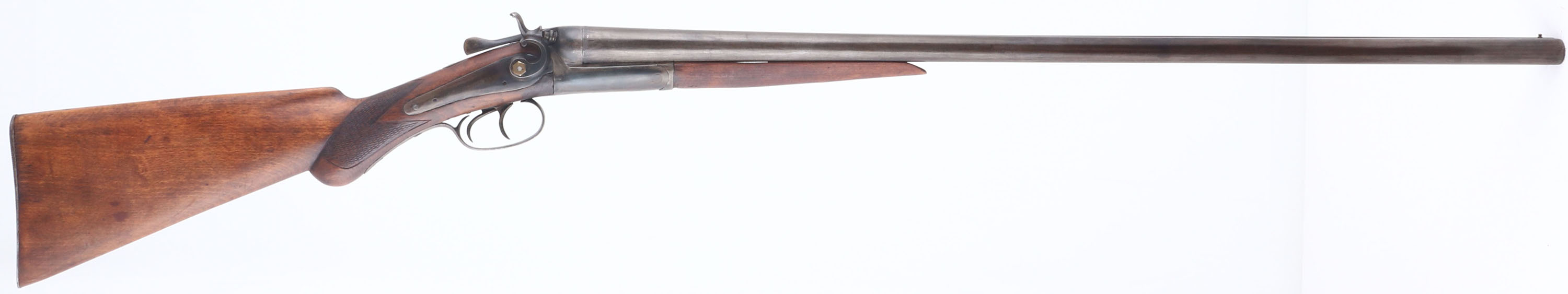 Richmand Arms, Double Hammer, CAL: 12 GA, MFG: 1890's, SN: 6397, Break Action Hammer SxS Shotgun, Choke: MOD/MOD, 30 1/4'' barrel, with ''Belgian Laminated Steel'' inscribed on the solid rib. The checkered & round knob pistol grip wood stocks are good & solid, having been sanded & refinished. The checkering on the forend is gone & there is some added filler on the right side of wrist above trigger, as well as some scratches remaining. The metal finish on the barrels & receiver is a spotty uneven mix of blue & brown added finish. Serial number on the barrel is ''5403'', while the water table is ''6397''. Bores are good. The solid, matted rib holds a single front bead. Buttstock carries the original metal buttplate. The head of the screw holding on the left hammer is broken off & the right hammer is held on with a brass nut. Break lever holds barrels, but has lost its spring. LOP: 14 1/4''. Antique, No FFL Req - Value: 100 to 300