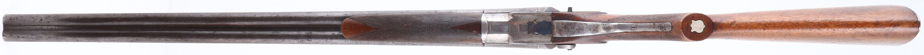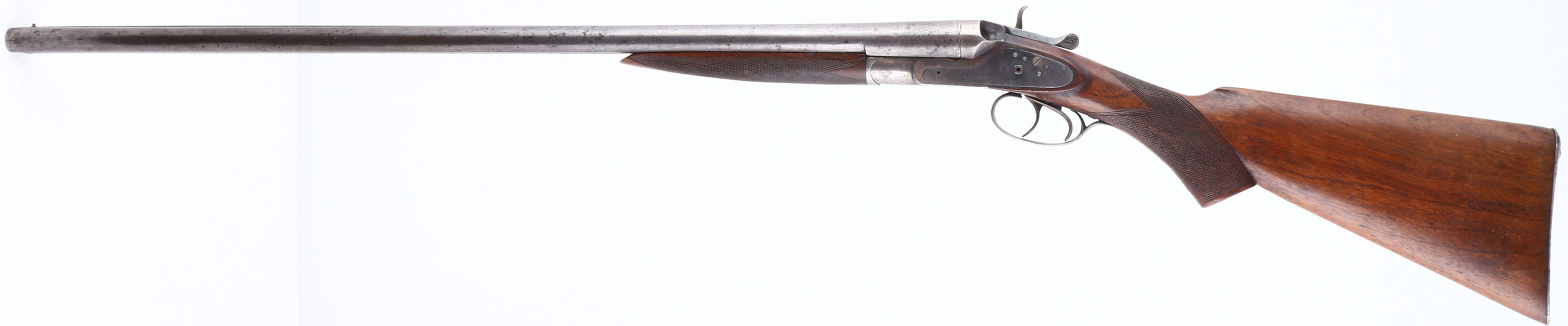 Manhattan Arms Company, CAL: 16 GA, MFG: 1880-95, SN: 13207, Break Action Hammer SxS Shotgun, Choke: F/MOD, 28'' Twist barrels, with solid matted rib. Manhattan Arms Company was a trade name used on shotguns by both Neumann Freres & Company & F. Dumoulin & Company both of Liege Belgium in the period circa 1880-1914. The checkered & flat pistol grip wood stocks are very good, displaying a several minor scratches, scrapes & contusions to the original finish. The left side of stock is stamped ''MONTANA ARMORY BOZEMAN MONT.'' There is a silver shield inlaid in the flat of the pistol grip. The metal finish on the barrels has worn gun metal gray, with some brown spots. The case-hardened receiver & break lever display fading case-colors in protected areas. The left side hammer & both nipples are missing. Serial number or partial # is stamped on the barrel, water table & inside of forend. Bores are excellent. The solid, matted rib holds a single front bead. Buttstock carries the original metal buttplate. LOP: 13 3/4''. Antique, No FFL Req. - Value: 150 to 300