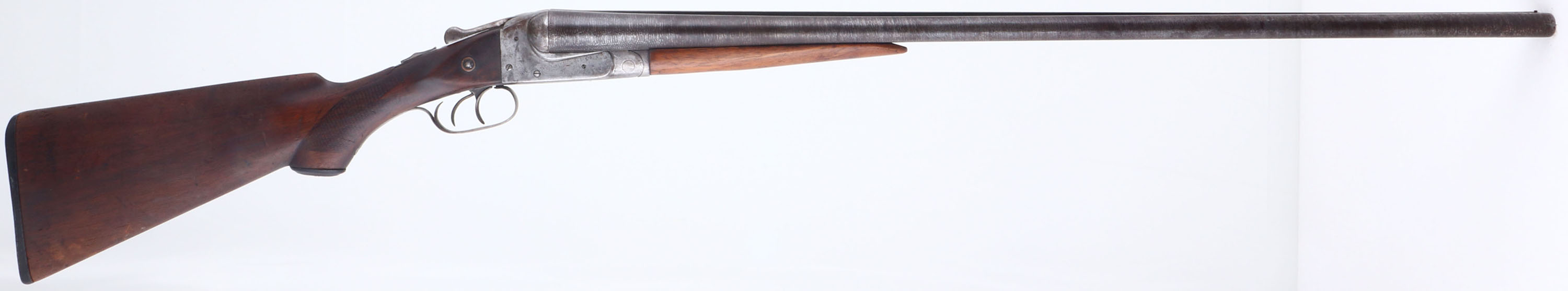 Ithaca, Lewis Model, CAL: 12GA, MFG: 1905, SN: 108302, Break Action SxS Shotgun, 32'' twisted steel barrels. The refinished, checkered & capped pistol grip wood stocks are good. The buttstock has multiple cracks at the wrist, an edge chip, alongside multiple contusions, scrapes & dings. The twisted steel barrels have toned to a mix of metal grey & brown patina. The receiver has fully toned to gun metal grey, with spotting, toned to a brown patina. Bores are poor, dark & worn. The solid matted rib holds a front bead. Worn Ithaca plastic buttplate. Double triggers. FFL or C&R Req. - Value: 100 to 300