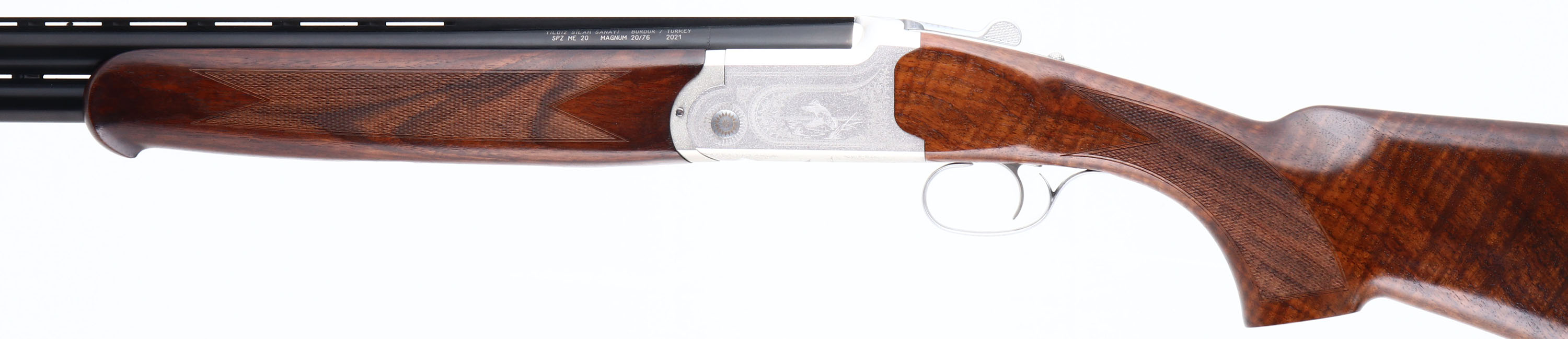 NEW, Yildiz, SPZ ME/20, CAL: 20 GA, MFG: Modern, SN: U78705, Break Action O/U Shotgun, Choke: 5pc Mobilchoke System, 28'' barrel with dual ventilated rib. The deluxe Turkish walnut, checkered flat pistol grip wood stocks are excellent. The 7075 white alloy receiver is excellent & the metal blue finish on the barrels rates 100%. The receiver, trigger guard & break lever display an intricate engraving, a duck on either side of the receiver in a pond setting, a dove on the bottom in a similar setting & ''YILDIZ SILAH SANAYI'' also on the bottom, next to the trigger guard. All engravings are bordered by an attractive ornamental/floral pattern. Bores are excellent. The barrel holds a single front bead. Buttstock carries a solid black rubber recoil pad. Comes in box with original packaging, owners manual, choke tool & extra chokes. This is a NIB gun, never fired. A great addition to any collection! FFL Req. - Value: 1000 to 1500