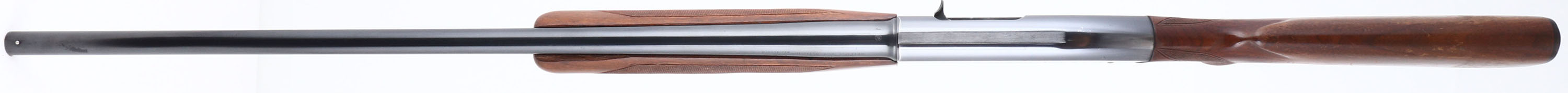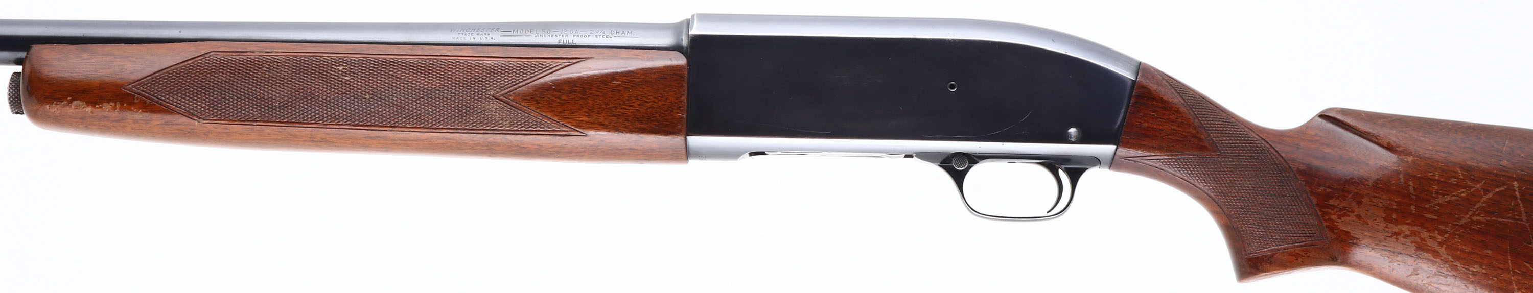 Winchester Model 50, CAL: 12 GA, MFG: 1956, SN: 59165, Semi-Auto Shotgun. Choke: F, 30'' barrel. The original checkered & flat pistol grip wood stocks are very good. They display a few minor nicks, dings & flaking to the original finish. The original metal blue finish rates 90% on barrel, 85% on receiver. Bore is very good. The barrel holds a single front bead. Buttstock carries a Winchester plastic buttplate. LOP: 14''. FFL or C&R Req. - Value: 250 to 500