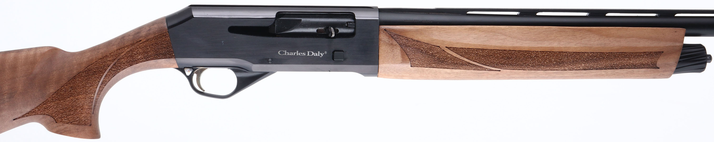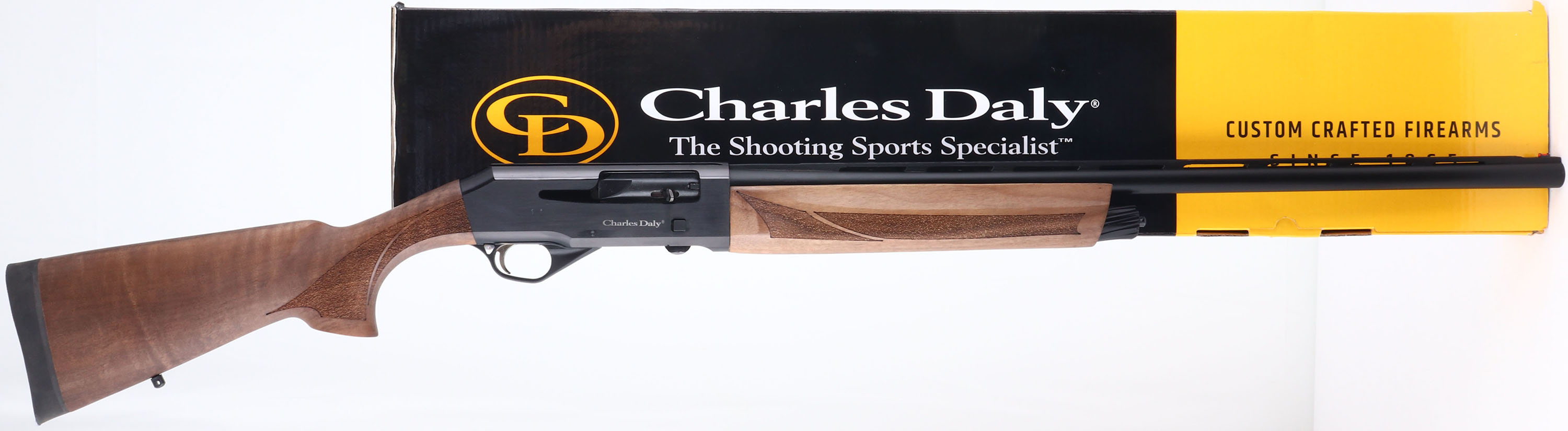 BOXED, Charles Daly, Model 601, CAL: 12 GA, MFG: Modern, SN: 538H21YT7242, Semi-Auto Shotgun. Choke: F, 28'' Ventilated rib barrel. The original textured & flat pistol grip wood stocks are excellent, with no marks to the excellent original finish. The original metal blue finish rates 100% on barrel, 99% on receiver. Bore is excellent, near mint. The barrel holds a red fiber optic front sight. Buttstock carries the original solid recoil pad. Gold tone trigger. Sling stud in stock. Comes in the original factory box with paperwork. Basically NIB. LOP: 14 3/8'' over pad. FFL Req. - Value: 250 to 400