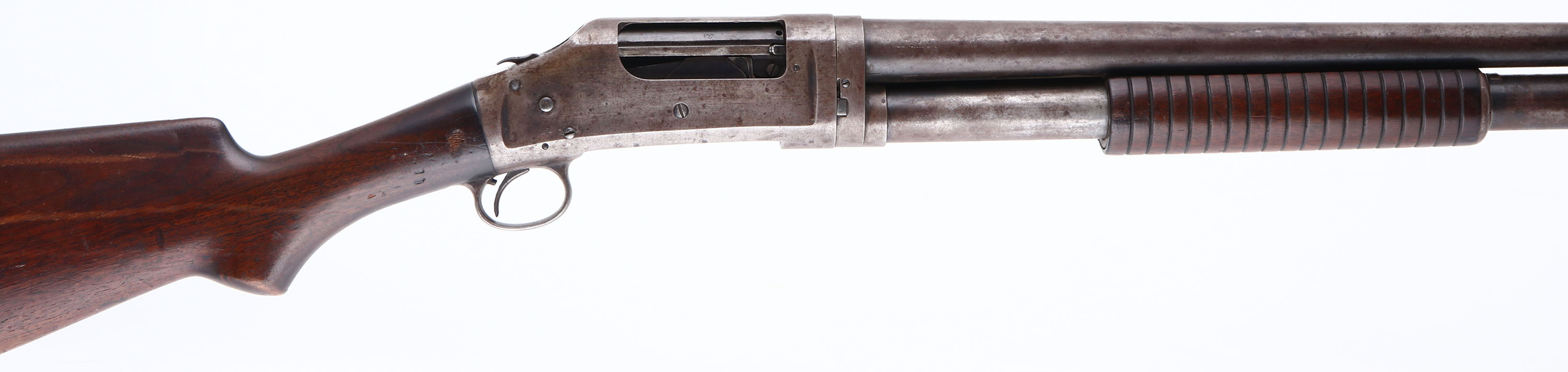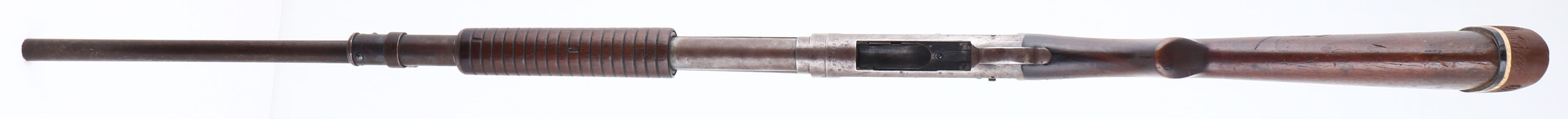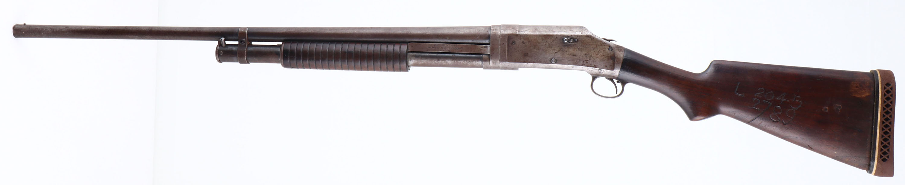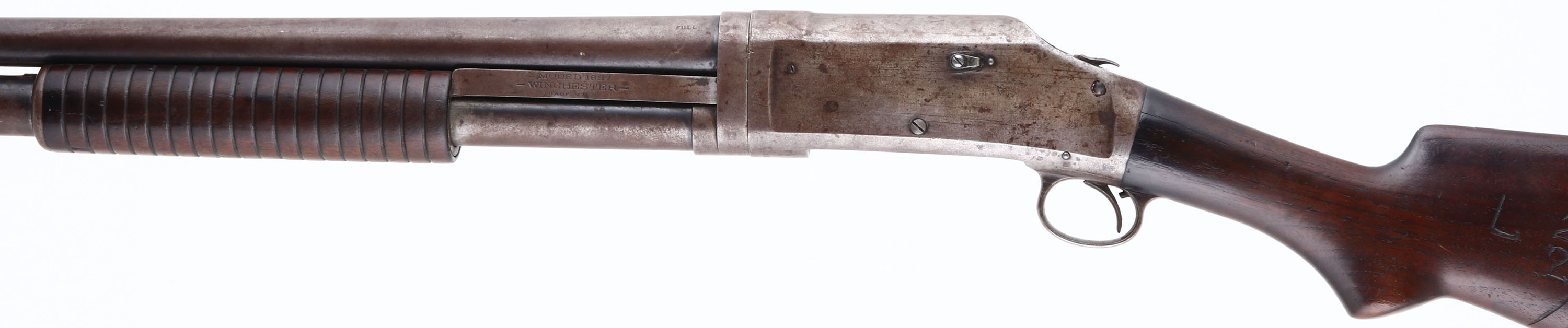 Winchester, Model 1897 Take-Down, CAL: 16 GA, MFG: 1907, SN: 363522, Pump Action Shotgun, Choke: Full, 28'' barrel. The original pistol grip stock & corncob forend are good & solid. The stocks have small scrapes, gouges & contusions to the thinning original finish. The stock has two 1'' stress cracks at the wrist & a couple of 2'' cracks at the buttend.. The left side of the stock ha ''L20452789'' carved into it. The metal finish has worn to a mix of gun metal gray & a rust brown patina, with spotting & light pitting. Bore is fair, with large spots of rust pitting. Barrel holds a single front bead. Stock carries a poor fitting ventilated recoil pad, which is loose. FFL or C&R Req. - Value: 200 to 400