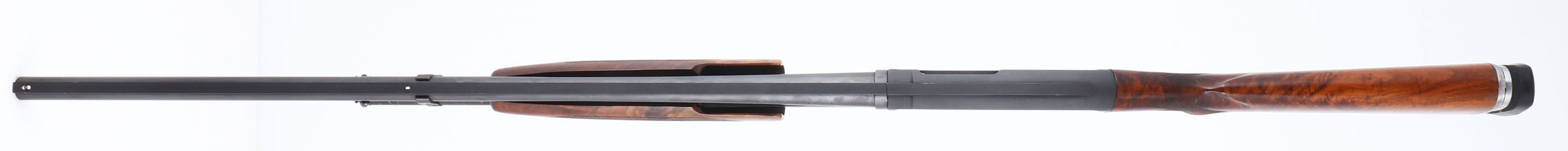 Winchester, Model 12 Deluxe, CAL: 12 GA, MFG: 1943, SN: 1028615, Pump Action Shotgun, Choke: Full, 30'''. The deluxe checkered & flat pistol grip wood stocks are excellent. The stock has been nicely refinished, while the forend carries the original finish, with some spider webbing. The stocks display wonderful scalloped & fiery grain, with hardly a handling mark. The original metal blue finish rates 95% overall. Bore is excellent. Mid & front bead. Buttstock carries a Morgan Adjustable solid recoil pad. A fantastic & striking deluxe Winchester. FFL or C&R Req. - Value: 1000 to 2000