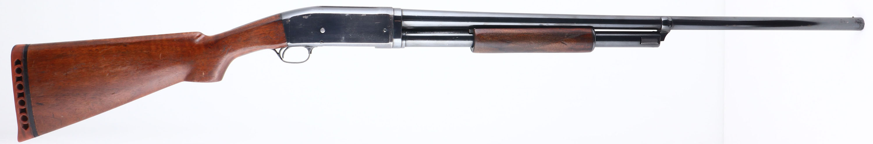 Remington, Pre Model 10 Trap Grade, CAL: 12 GA, MFG: 1908, SN: 7962, Pump Action Shotgun, Choke: Full, 30'' No rib barrel. The flat pistol grip wood stock appears to be an accurate & vintage replacement, with a perfect fit. The checkered forearm appears original. Both are very good & solid, showing lots of wear & thinning to the finishes. There are small scratches & contusions. The metal blue finish rates 80% on barrel, 70% on the receiver, with speckled rust pitting, mostly on the receiver. Bore is very good. The barrel holds a front bead. Stock carries a vintage Red Head ventilated recoil pad. Pump action functions properly, but trigger doesn't appear to engage & will not fire. This gun needs to be repaired & is being sold ''AS IS'', with no returns. FFL or C&R Req. - Value: 200 to 400