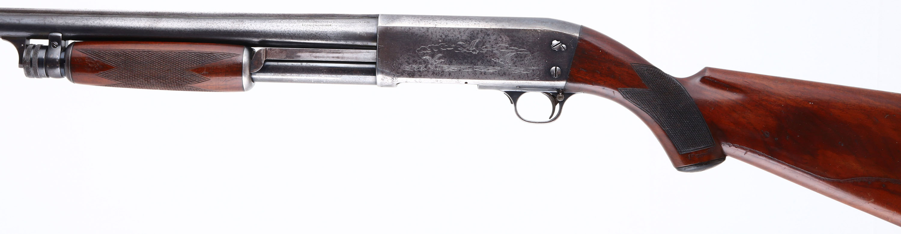 Ithaca, Model 37R (Solid Rib), CAL: 12 GA, MFG: 1940, SN: 29389, Pump Action Shotgun, Choke: Full, 2 3/4'', 30'' barrel. The original checkered & capped pistol grip wood stocks are very good. They carry the original finish with several scrapes, scratches & dings, & one large finish scrape to the left side which runs the length of the stock. The original metal blue finish rates 60% overall, with some spotting & speckled loss. Receiver has hunting scenes on each side. Bore is excellent. The solid rib barrel holds an ivory mid bead & a gold tone front bead. Buttstock carries a period Hawkins ventilated recoil pad. FFL or C&R Req. - Value: 500 to 800