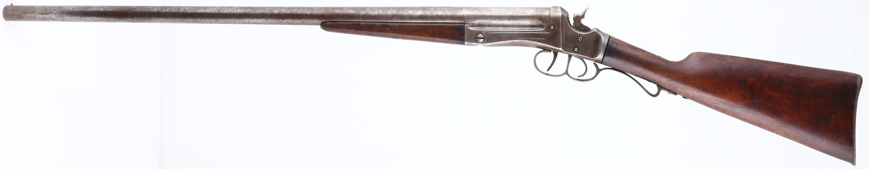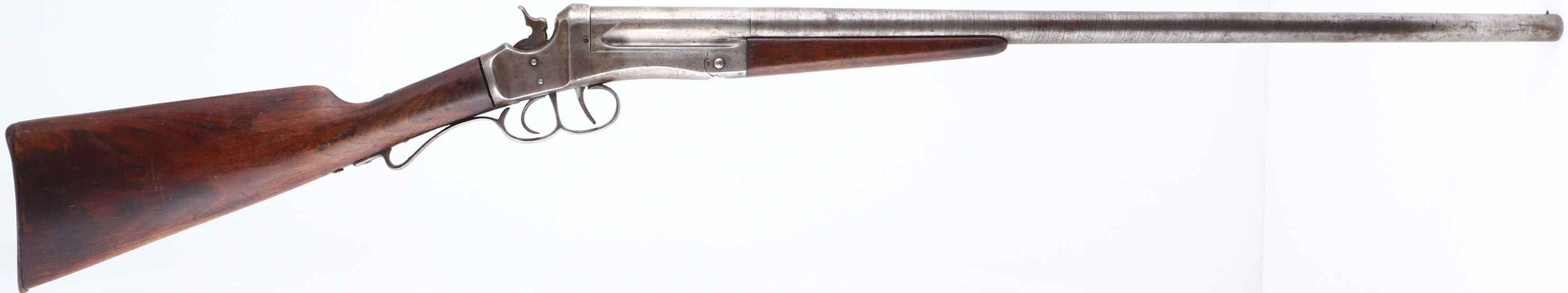 C.S Shattuck, American, CAL: 12 GA, MFG: 1870's to 1910's, SN: 2258, Triggered Break Action Single Shot Shotgun, 34'' barrel. The straight grip wood stock & small forend are very good. There are contusions, scrapes & dings throughout, with oils added over time. The twisted steel pattern on the barrel is visible, mostly worn to metal grey, with areas toned to a brown patina. The receiver has worn to metal grey, with a thin brown patina. Bore is very good, with roughness & light pitting. The barrel holds a single front bead. Smooth metal buttplate. FFL or C&R Req. - Value: 100 to 300