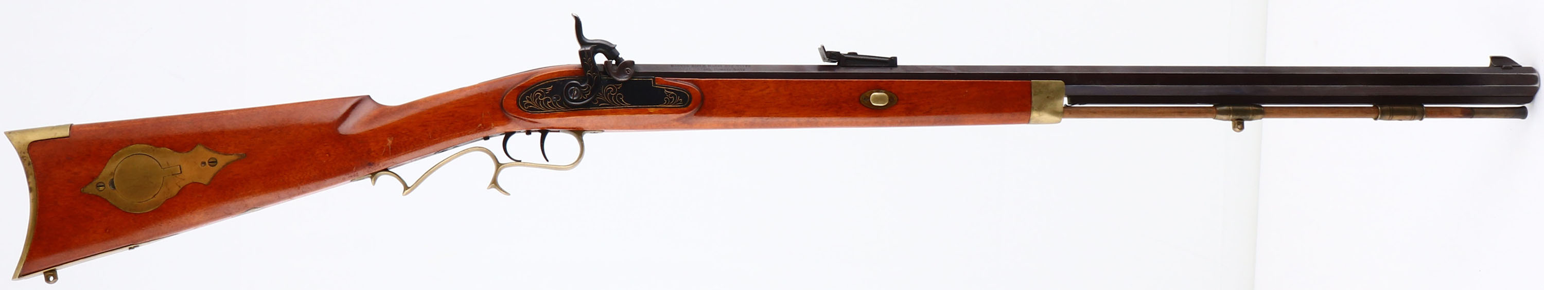 Sears, Hawken Rifle Model 292.51779, CAL: 50, MFG: N/A, SN: 0781, Black Powder Muzzleloader, 28'' octagon barrel. The cheeked straight grip wood stock is excellent. There are minor handling marks to the high gloss finish. The metal blue finish on the barrel rates 85%, toned to a brown/plum patina. The receiver rates 95%, with gold tone engravings. Bore is excellent. The barrel holds an adjustable rear sight & blade front sight. Brass crescent metal buttplate. All brass hardware. Sling studs. Cleaning rod present. Black powder, No FFL Req. - Value: 150 to 350
