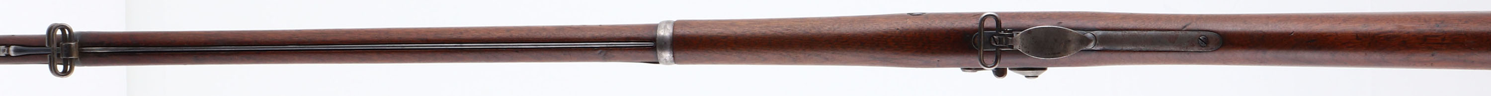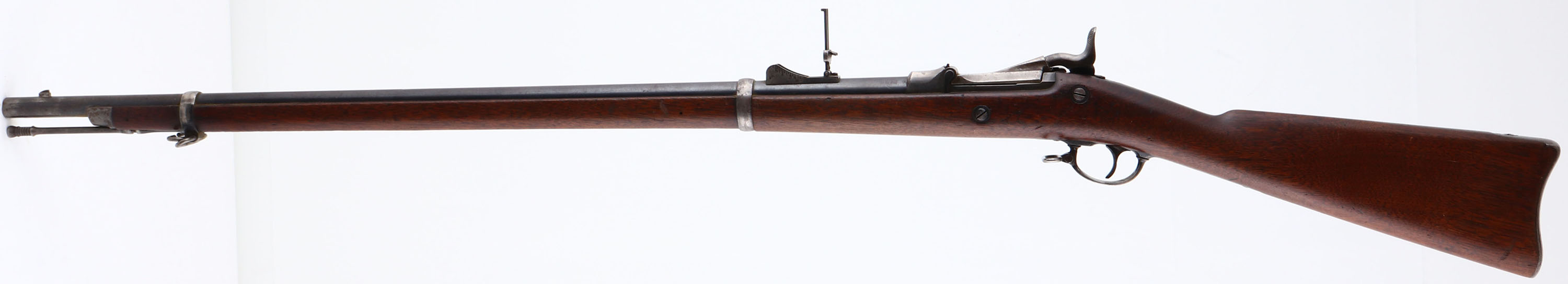 Springfield. Model: 1873. Cal: 45-70. MFG: 1881. S/N: 152985. Trapdoor breech loader. 32 1/2'' Barrel. The straight wrist wood stock is very good, scratches, dents, gouges, chips & wear from use/age, Cartouche on left side of stock above trigger that reads ''SWP 1881'' in box. Metal finish on barrel rates 60% with spots worn to a gun metal gray & spots being brown patina, receiver has worn to a even gun metal gray with no case hardening left. Lock plate has some bluing left & is marked with eagle, ''U.S. Springfield'', top of breech block is marked ''MODEL 1873'', rear of receiver is marked with S/N, left side of barrel is marked with ''V'' over ''P'' over Eagle, ''P'', both barrel bands marked with ''U''. Bore is good bright with light roughness amongst thinned rifling. Blade front sight, U-notch tangent/ ladder rear sight marked 1 to 5 on left side of base & 6 to 12 on ladder. Metal buttplate worn to a gun metal gray with spots of rust & brown patina, ''US'' marked on upper tang. Bottom sling swivel & stacking swivel, has cleaning rod. Antique No FFL Req. - Value: 300 to 600
