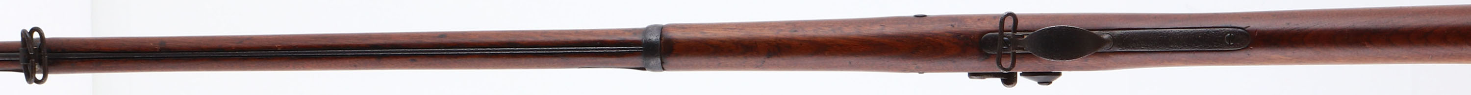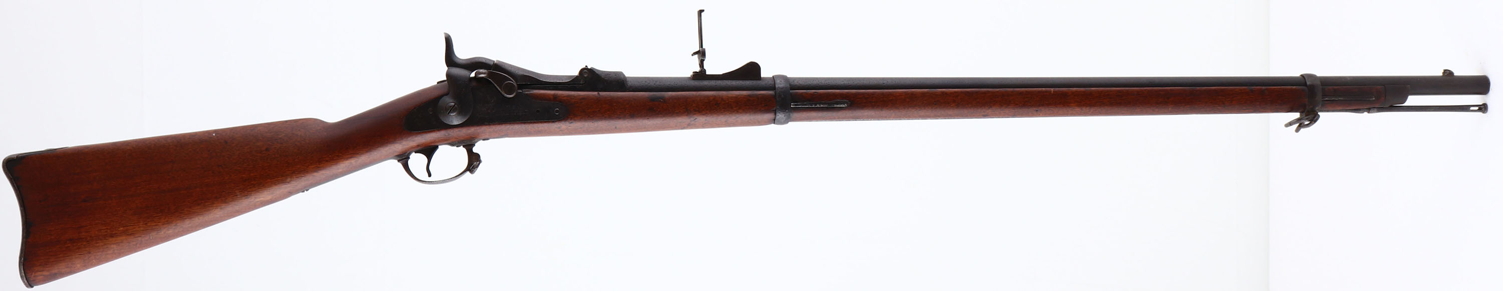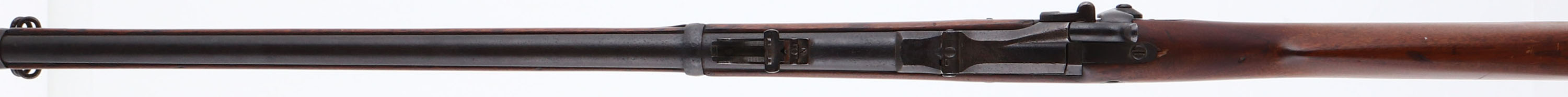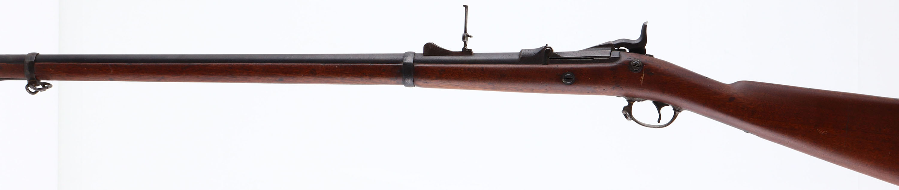 Springfield. Model: 1873. Cal: 45-70. MFG: 1883. S/N: 221915. Trapdoor breech loader. 32 1/2'' Barrel. The straight wrist wood stock is very good, scratches, dents, gouges, chips & wear from use/age. All metal parts have cleaned pitting, with possible layer of black finish added after cleaning. Lock is marked with eagle, ''U.S. Springfield'', top of breech block is marked ''MODEL 1873'', rear of receiver is marked with S/N, left side of barrel is marked with ''V'' over ''P'' over Eagle, ''P'', both barrel bands marked with ''U''. Bore is very good bright with light roughness in spots. Blade front sight, U-notch tangent rear sight. Metal buttplate with cleaned pitting & spots of rust with faint ''U'' marked on upper tang. Bottom sling swivel & stacking swivel, has cleaning rod. Antique No FFL Req. - Value: 300 to 600