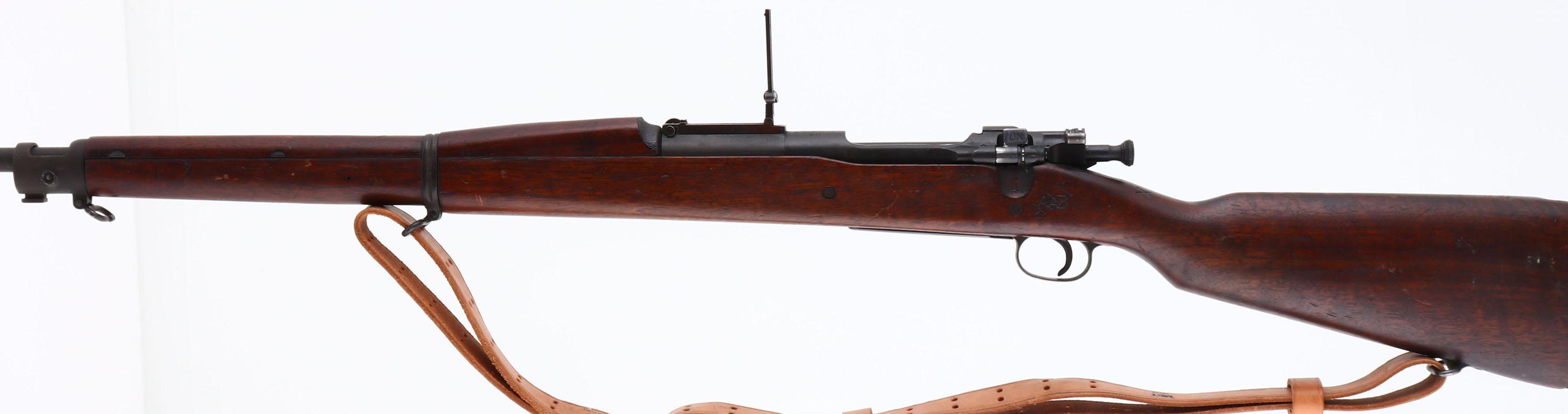 Springfield Armory. Model: 1903A1. Cal: 30-06. : MFG: 1930. S/N: 1354492. Bolt Action Rifle. 24'' Round Barrel. The semi pistol grip Type C stock is very good. There are scratches, dings & gouges from use & age, ''P'' & faint circle cartouche, left side stock above trigger stamped with ''AAB'', ''AAX'' over stamped together, top of wrist is marked ''X76'', top rear of stock by buttplate marked ''2504'', belly of stock marked with two ''M'' stamps, two 'E'' stamps on bottom of stock in front of magazine, ''S'' marked in grove for magazine cutoff. The metal retains 85% finish overall with light wear. Top of receiver is marked, ''U.S.'', ''SPRINGFIELD ARMORY'', ''MODEL 1903.'', S/N, Top end of barrel is marked, ''S A'', flaming bomb, ''8-42'', rear barrel band is marked ''U''. Bore is very good, bright with light roughness. Hooded blade front sight, U-notch & aperture ladder rear sight marked 3 to 27. Military trapdoor buttplate. Bottom sling swivels & stacking swivel, comes with period correct leather sling. FFL or C&R Req. - Value: 700 to 1400