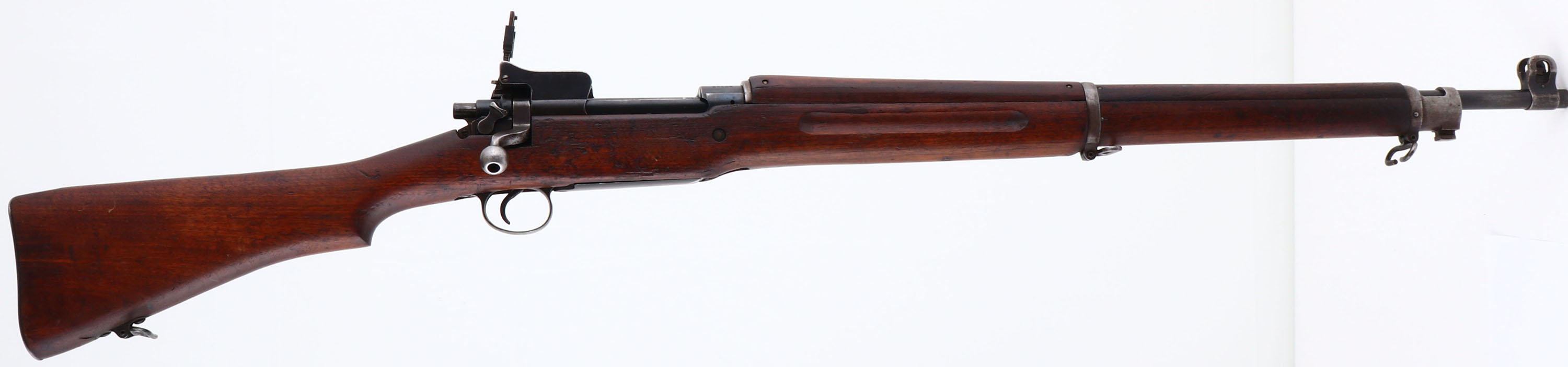 Winchester. Model: 1917. Cal: 30-06. MFG: 1917. S/N: 26154. Bolt action Rifle. 27'' Barrel. The semi Pistol grip wooden stock is very good with scratches, dents, dings, & wear from use/age, faint cartouche on bottom of stock at wrist, ''O.G.E'' in box cartouche on left side of stock above trigger, ''W'' marked on end of wood in front of bayonet lug. The metal finish rates 80% overall with spots of light wear & thinned bluing. Left side of receiver is marked with Flaming bomb & Star inside a circle stamp, Top of receiver is marked ''U.S.'', ''MODEL OF 1917'', ''WINCHESTER'' & S/N, end of barrel is marked ''W'', flaming bomb, ''3-17''. Bore is good, roughness with strong rifling. Blade Front sight with protective wings, aperture ladder rear sight marked 2 to 16. Metal trapdoor buttplate, worn finish, brown patina, & sticker. Bottom sling swivels. FFL Or C&R Req. - Value: 600 to 1200
