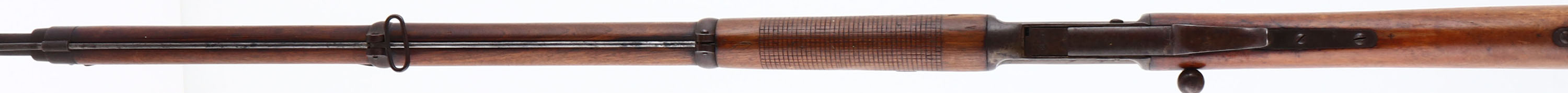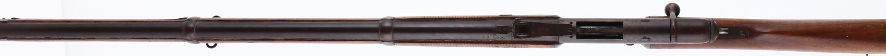 Berne (MW), Model: 1878, Cal: 10.4x33mm, MFG: 1878-89, S/N: 92541, Bolt action Rifle, 33 1/8 '' Barrel, The straight wrist, two piece, checkered, wooden stock is very good with scratches, nicks, dings & dents from wear/age, right side of stock has faint cartouche, left side of stock is marked, ''1917'' & has cartouche above it. The metal has toned to a even brown patina with spots of gray showing. Left side of receiver is marked, cross over ''MW'', S/N, left side of barrel is marked, ''1917'', cross over ''MW'', S/N, top of barrel is marked with same marking that was on left side of stock, A 77, & proof marking, S/N mismatched bolt, bore is fair, pitting & rust with strong rifling. Blade front sight, adjustable V-notch rear sight. Metal buttplate with rust & patina. Antique No FFL Req. - Value: 200 to 400
