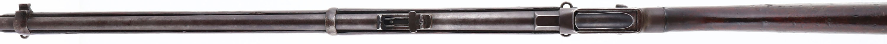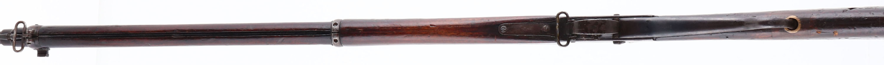 Enfield, Model: Martini-Henry MK-IV, Cal: .577/450, MFG: 1886, S/N: 8960, dropping block breech loading rifle, 33 1/4'' barrel. The straight wrist wood stock is good with nicks, scratches, dings, dents, chips & wear from use & age, stock has darkened from oil & age, stock appears to have had stock replaced at arsenal from a older model of rifle that had a shorter lever, 1 3/4'' by 1 1/4'' inlaid piece of wood with brass cup for hook of lever to go into to on bottom of stock, 3/4'' in diameter circler piece of wood inlaid into bottom of stock with a nail securing, possible repair from where the old hole for where the hook of lever goes into used to be for the older short lever, filler puddy in spots on stock, 1'' by 1'' piece of wood repair inlaid into top of stock by wrist, multiple cracks at wrist of stock emanating from where stock meets receiver, all stock repairs are old & appear to have been done at a military arsenal a very long time ago, lettering/symbols painted in yellow on left side of stock. The metal has toned to a gun metal gray & brown patina with stock finish in areas, right side of receiver is marked crown over, ''V.R'', ''ENFIELD'', ''1886'', crown over downward facing arrow, ''I.V'', ''1.'', bottom of lever is marked with arrow facing up over ''WD'', crown over ''E'', ''20'', ''E-M'', lever appears to have been heated in one area possibly done to bend lever back straight at a arsenal, bottom front tang is marked with arrow facing up over ''WD'', crown over ''82'', ''M'', barrel is marked with S/N lined through ''B'' & proof marks. Bore is very good, shiny with one spot of roughness. Barley corn front sight, U-notch ladder/tangent rear sight marked 100 to 400 on right side of sight base, & ladder is marked 6 to 12. Bottom sling swivels, has cleaning rod. Antique No FFL Req. - Value: 400 to 800