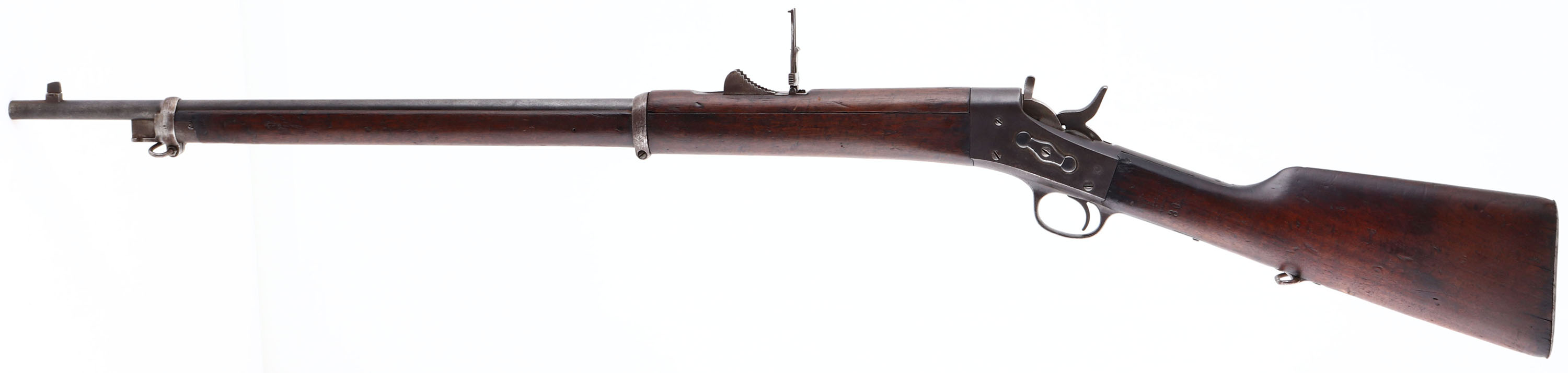 Remington, Model: Rolling block No.5 M1902, Cal: 7x57mm, MFG: 1902-17, S/N: 318, Rolling block breech loading rifle, 36'' Barrel. The straight wrist wood stock is very good with scratches, nicks, dings, dents & wear from use/age, top of upper handguard has two 4 5/8'' cracks running from receiver to cutout for the rear sight, Left side of stock by wrist is marked, ''30''. The metal overall has toned to a even gray/brown patina with areas of gun metal gray showing. Upper tang is marked, ''REMINGTON ARMS COMPANY ILION, NY'', & various patent dates, top of barrel is marked, ''7M.M-S.M.'', S/N marked on left side of lower tang, hidden under stock. Bore is very good, bright with strong rifling. Barley corn front sight, V-notch tangent/ladder rear sight marked 2 to 13 on base & 14 to 21 on ladder. Metal buttplate worn gray with some patina. Bottom sling swivels, missing cleaning rod. These rifles were purchased by many countries and most don't have many if any distinguishing markings on them so its hard to identify where it came from. FFL Or C&R Req. - Value: 500 to 1000
