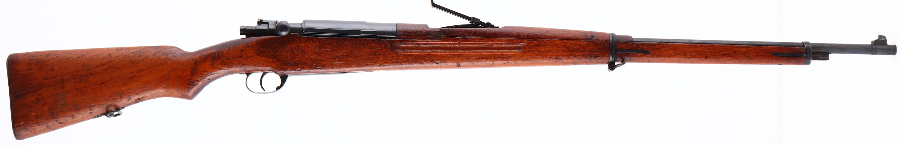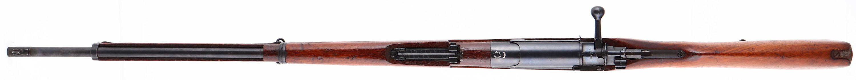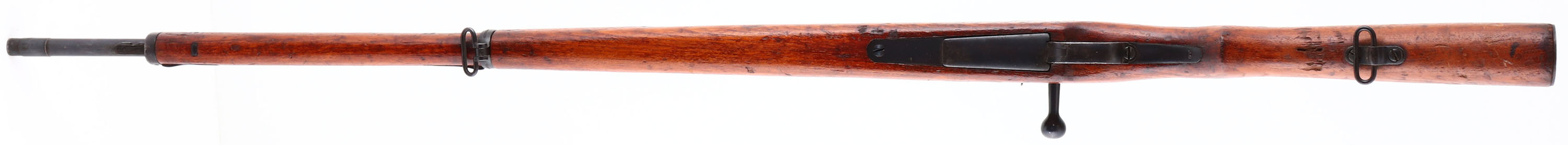 Koishikawa Arsenal, Model: type 46/66 CAL: 8 x 52mmR Siamese, MFG: 1903 - 08, S/N: N/A, Bolt Action Rifle, 29 3/8'' barrel. The semi-pistol grip wood stock is very good with contusions, scratches, scrapes & dings, faint type A cartouche on bottom of stock in front of sling swivel. The metal finish rates 95% overall. Top of receiver is marked with Siamese crest & ''R.S.121'' in Thai, receiver bridge is marked with original S/N in Thai Numerals & reads ''30450''. The left side of receiver is marked with Arsenal mark & type B stamp. Bore is very good, bright with light roughness in spots. The barrel holds a barleycorn front sight & V-notch ladder rear sight marked 2 to 20 in Thai Numerals. Buttstock carries a military style trapdoor buttplate, with brown patina & rust. missing cleaning rod. FFL or C&R Req - Value: 200 to 400