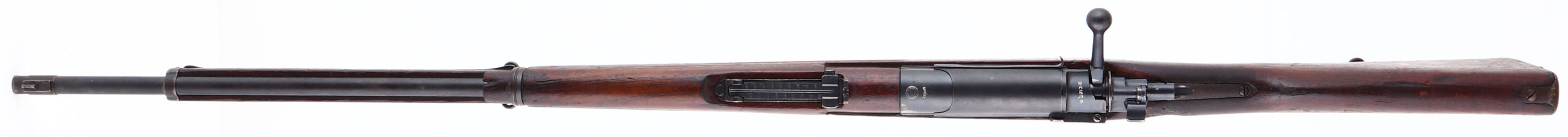 Koishikawa Arsenal, Model: type 46/66 CAL: 8 x 52mmR Siamese, MFG: 1903 -08, S/N: 79356, Bolt Action Rifle, 29 3/8'' barrel. The semi-pistol grip wood stock is very good with contusions, scratches, scrapes & dings, darkening from age/oil, Type A cartouche on bottom of stock in front of sling swivel. The metal finish rates 85% overall, with spots worn gray. Top of receiver is marked with Siamese crest & ''R.S.121'' in Thai, receiver bridge is marked with original S/N in Thai Numerals & reads ''36302''. The left side of receiver is marked with importer S/N, Arsenal mark & type B stamp. Bore is very good, bright with light roughness in spots. The barrel holds a barleycorn front sight & V-notch ladder rear sight marked 2 to 20 in Thai Numerals. Buttstock carries a military style trapdoor buttplate, with brown patina & rust. missing cleaning rod. FFL or C&R Req - Value: 200 to 400