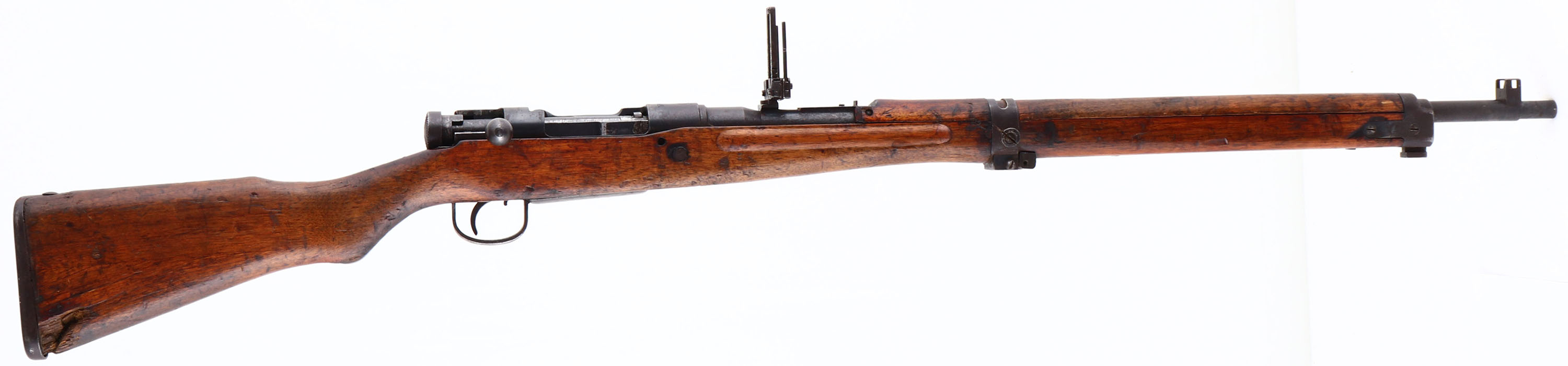 Nagoya Arsenal, Model: Type 99, Cal: 7.7 Jap, MFG: 1939-1945, S/N: 53949, 2nd serial block, Bolt Action Rifle. 25 5/8'' Barrel. The semi pistol grip wood stock is very good with scratches, chips, dents, gouges & wear from use/age, possible shrapnel damage at toe of stock. The metal finish rates 85% overall with small spots of wear & patina. Left side of receiver is marked with S/N, arsenal stamp, top of receiver is marked with chrysanthemum & ''Type 99'' In Japanese, S/N mismatched bolt. Bore is very good, bright with thinned rifling. Barleycorn front sight with protective ears, Aperture Ladder rear sight marked 3 to 15, Has folding anti-aircraft sight wings & are marked 2 to 3. Metal Butt plate with wear & brown patina. Side sling swivels, missing cleaning rod. FFL Or C&R Req. - Value: 250 to 500