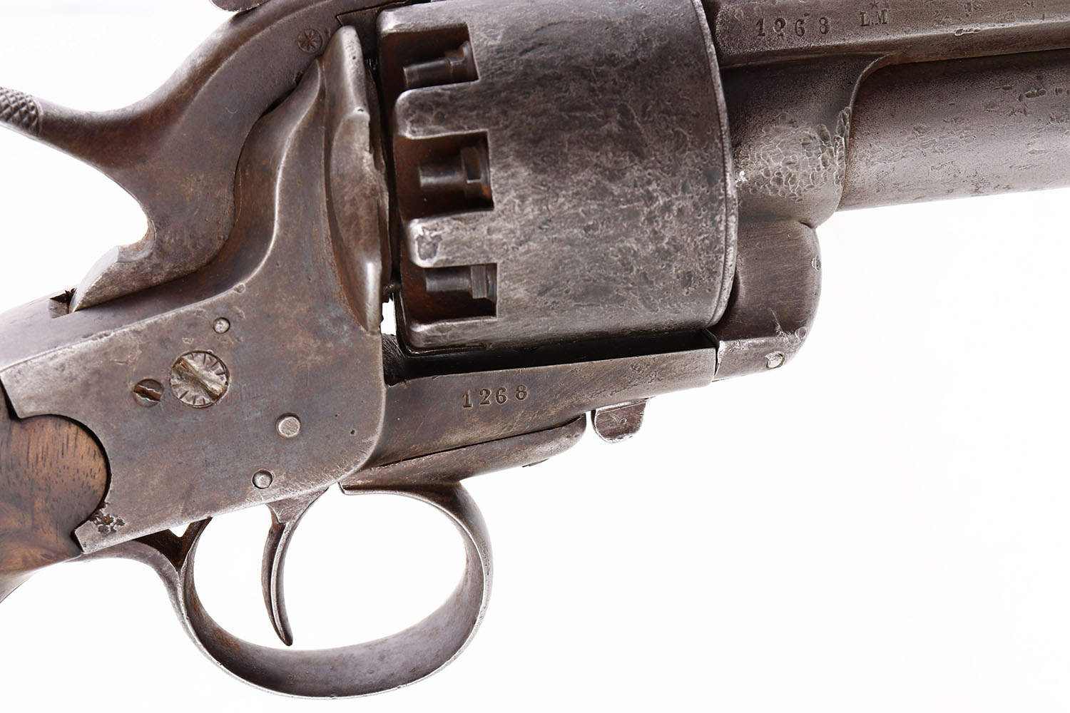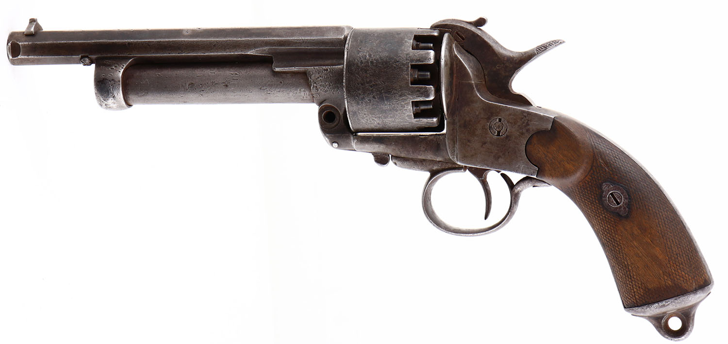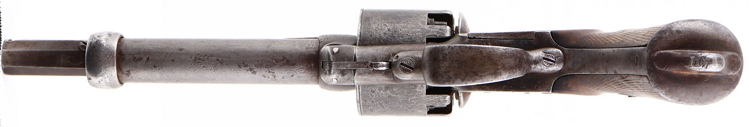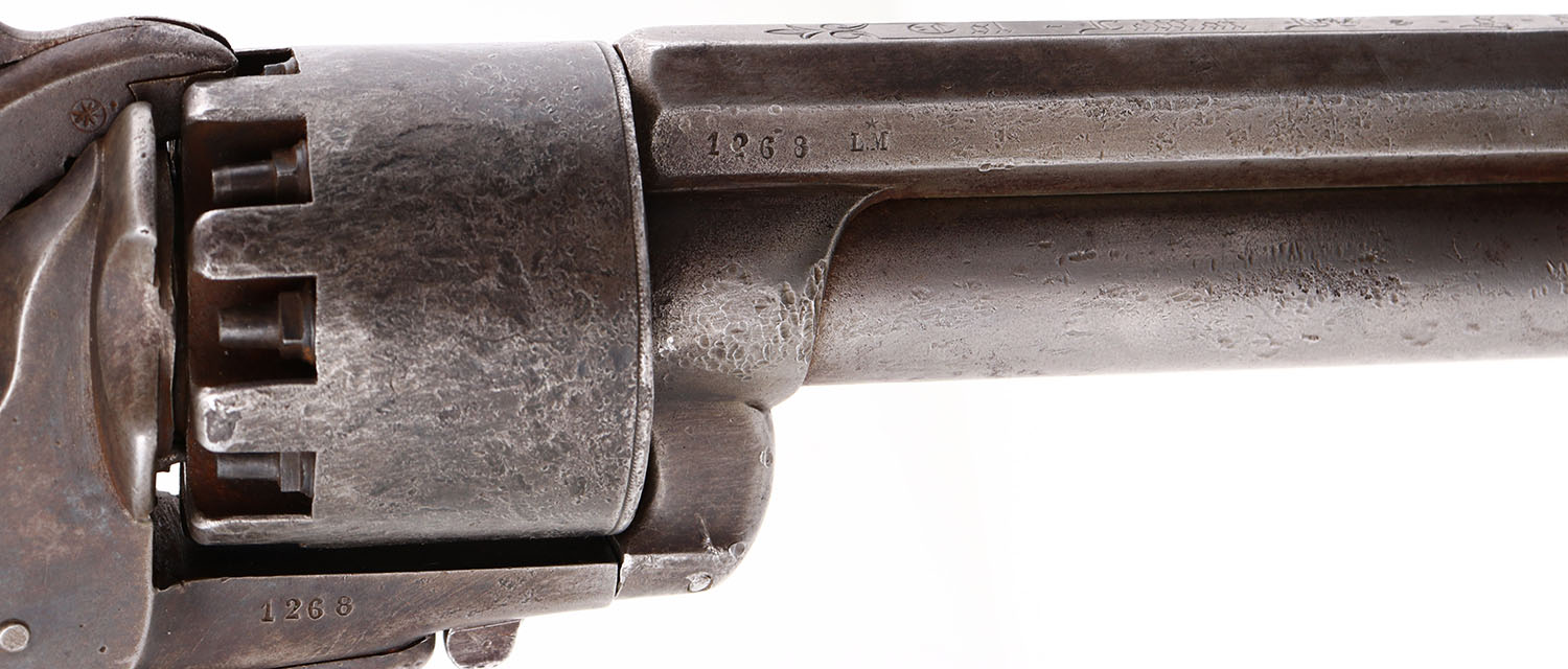 EXTREMELY RARE! LeMat, ''Grape-Shot'' Revolver, CAL: measures .42 & .64, MFG: 1856-65, SN: 1268, O/U Percussion Revolver, 6 3/4'' top barrel, 5'' lower barrel, 9 shot cylinder. This unique sidearm was known as the ''Grape-Shot'' revolver. It was developed in New Orleans, LA in 1856 by Jean Alexandre Le Mat, whose efforts were backed by P. G. T. Beauregard, who became a general in the Confederate States Army. When war broke out, LeMat received Confederate contracts to produce 5,000 revolvers. Plans were then made to manufacture the gun across seas & then import them into the Confederacy. Confederate gun runners were able to slip shipments of the gun through the U.S. Navy blockade & it is estimated that about 2,500 out of the 2,900 produced made it into Confederate service. LeMat's revolver were used by famous Confederate officers such as: Major Generals Braxton Bragg, J. E. B. Stuart, Richard H. Anderson, and Captain Henry Wirz. Confederate Major General J. E. B. Stuart was known to favor the LeMat revolver over others at the time. The top rib is marked ''Col. Le Mat Bte s-g-d-g Paris''. The right side of the barrel is marked with the full SN ''1268'' followed by a ''(star) over LM'' marking (collectors believe this to be Confederate). The SN is repeated on the right side of the frame. The left side of the hammer is marked with a ''0'' & the right side has a crude ''star''. The screws all have minor engravings, consistent with other seen examples. The original, checkered wood grips are excellent, with smooth checkering. The metal has worn to a mix of metal grey, remaining blue & brown patina, with cleaned pitting & dings throughout. Top bore is very good, with pitting & roughness amongst proud rifling. Bottom bore is very good, with consistent roughness. The barrel holds an original front sight. Lanyard loop present. Missing ram rod. Comes with an aged leather holster. This is your opportunity to own a rare piece of Civil War history.* Antique, No FFL Req. - Value: 10000 to 20000
