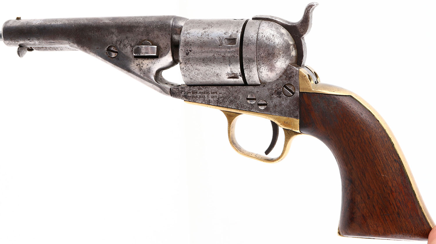 Colt, Model 1862 Police & Pocket Pistol of Navy Caliber, CAL: 36, MFG: 1865, SN: 29102, Single Action Revolver, 4 1/2'' barrel. The top of the barrel has no address marking. The right side of the frame has two patent dates in two lines '' PAT JULY 25 1871'' & ''PAT JULY 2 1872''. The caliber marking can been seen on the trigger guard. All matching SN on the butt, trigger guard, frame & barrel housing. Non-matching cylinder with SN ''477102''. The refinished, original wood grips are excellent, with contusions & scrapes. The metal has fully worn to gun metal grey, with cleaned rust pitting, toned to a dark brown patina. The trigger guard & backstrap are brass, with a thin aged patina. Bore is very good, with consistent roughness & intermittent pitting. The barrel holds a worn front bead. Antique, No FFL Req. - Value: 1000 to 3000
