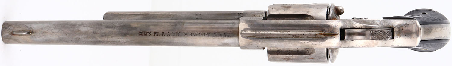 Colt, Frontier Six Shooter (Model 1878), CAL: .44WCF, MFG: 1882, SN: 7604, Double Action Revolver, 7 1/2'' barrel. The top of the barrel is marked ''COLT'S PT. F.A. MFG. CO. HARTFORD CT. U.S.A.''. The left side of the barrel is marked ''COLT FRONTIER SIX SHOOTER''. The markings appear to be modern restamp, with an acid etched side panel. The left side of the trigger guard is marked 44 CF & the bottom of the barrel is marked ''44''. The full SN can be found on the butt, ahead of the lanyard loop. The modern replica Rampant Colt checkered plastic grips are excellent. The metal has fully worn to gun metal grey, with areas of thin brown patina & dark brown spots from rust speckling. Bore is excellent & bright. The barrel holds a blade front sight. Lanyard swivel loop present. Cylinder has a bit of play when cocked. Antique, No FFL Req. - Value: 1200 to 2500