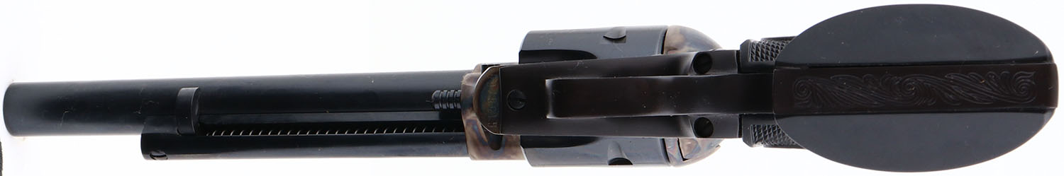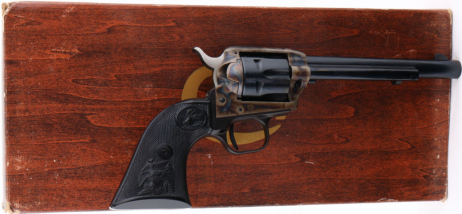 BOXED, Colt, Model PEACEMAKER, CAL: 22 LR, MFG: 1975, SN:G156765, Single Action Revolver, 6''' barrel. The left side of barrel is stamped ''PEACEMAKER .22''. The gun still carries the factory grease. The original Eagle & Rampant Colt, checkered grips are Mint. The metal blue finish on the barrel & cylinder rates 100%. The case-hardened frame displays vivid case-colors. Bore is mint. The barrel holds a front blade. Comes in a Colt wood grain box with paperwork & hang tag. A fantastic Colt Peacemaker. FFL Req. - Value: 1500 to 2500