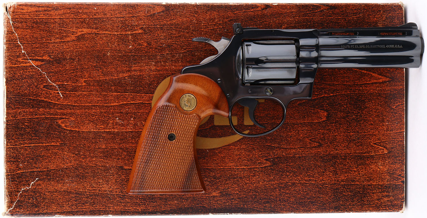 NEW BOXED, Colt, Model Diamondback, (D5140) CAL: 22 LR, MFG: 1977, SN:N13516, Double Action Revolver, 4'' barrel. The Colt Diamondback was introduced as a deluxe model in 1966, inspired by the successful Colt Python, in calibers of .22 LR, .22 WMR & .38 SPL. The Diamondback is built on the smaller ''D frame'', same as used in the Detective Special. It has a 6-shot swing-out cylinder & was available in blue or nickel finishes. It has a wide serrated target hammer, ventilated rib, fully adjustable target quality sights, & full-length barrel underlug. The left side of barrel is stamped ''DIAMONDBACK 22 LONG RIFLE''. They came with Colt brass medallion, checkered Walnut grips. The grips on this example are mint. The high polish metal blued finish is mint. Bore is mint. The matte finished top of the ventilated rib barrel holds a screw height adjusting ''U'' notch rear sight & front blade sight. This gun comes in its original Colt wood grain box, with Colt purchase letter, instruction manuals, hang tag. Screw driver tool coin, bag wrappings. Consigned by original buyer who claims it was never shot outside factory test. NOS. Nearly Mint in every way & extremely collectible. FFL Req. - Value: 2000 to 3000