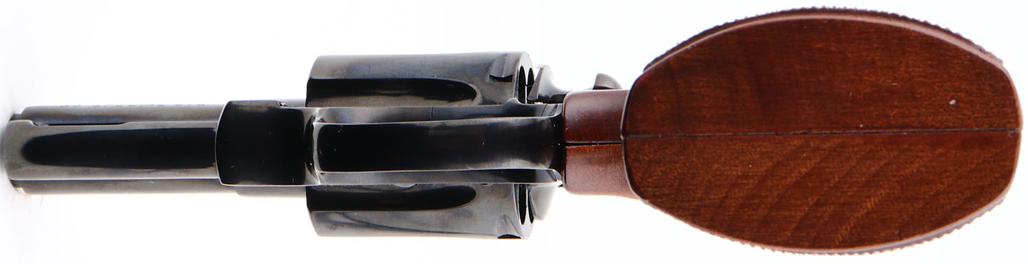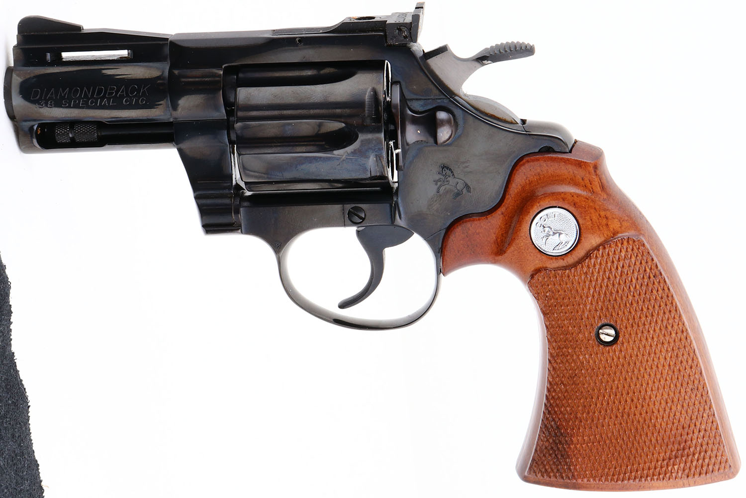 SCARCE BOXED, Colt, Model Diamondback, (D5520) CAL: .38 SPL, MFG: 1977, SN: R01641, Double Action Revolver, 2 1/2'' barrel. The Colt Diamondback was introduced as a deluxe model in 1966, inspired by the successful Colt Python, in calibers of .22 LR, .22 WMR & .38 SPL. The Diamondback is built on the smaller ''D frame'', same as used in the Detective Special. It has a 6-shot swing-out cylinder & was available in blue or nickel finishes. It has a wide serrated target hammer, ventilated rib, fully adjustable target quality sights, & full-length barrel underlug. The left side of barrel is stamped ''DIAMONDBACK .38 SPECIAL CTG''. The Colt silver medallion, checkered walnut grips on this example are near mint. The high polish metal blued finish is likewise near mint. Bore is mint. The matte finished top of the ventilated rib barrel holds a screw height adjusting ''U'' notch rear sight & front blade sight. This gun comes in its original Colt wood grain box, with instruction manual & purchase invoice. Very desirable & scarce 2 1/2'' variation. FFL Req. - Value: 2000 to 2500