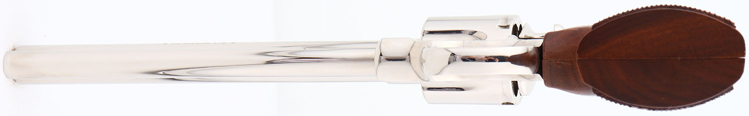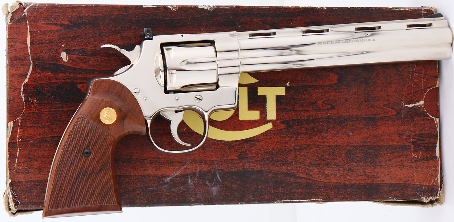 EXTREMELY SCARCE BOXED, Colt, Model Python TARGET, (I3686), CAL: .38 SPL-, MFG: 1980, SN: K02878, Double Action Revolver, 8'' barrel. In 1980 Colt produced 3,740 Phyton Target models with 8'' barrels in .38 SPL. Of those produced 3,489 were blued & only 251 nickeled. This is one of those rare 251 mfg, in nickeled finish, making this Python variation extremely rare. The Colt Python was introduced as a premium model in 1955, in caliber .357 Magnum, with some rare caliber variations produced along the way. The Python is built on the large I-frame & has a reputation for accuracy, smooth trigger pull, & a tight cylinder lock-up. It has a 6-shot swing-out cylinder & was available in Python blue, Royal blue, Python nickel & Python stainless steel finishes. Some firearm collectors & writers have described the Python as ''the finest production revolver ever made''. It has a wide serrated target hammer, ventilated rib, & fully adjustable target quality rear sights. The left side of barrel is stamped ''PYTHON TARGET * .38 SPECIAL CTG * ''. The Rampant Colt gold medallion, checkered walnut grips on this example are minty. The high polish nickel finish is minty. Bore is mint. The satin finished top of the ventilated rib barrel holds a screw height adjusting ''U'' notch rear sight & black front blade sight. This gun comes in its original Colt wood grain box, with booklet, pamphlet, hang tag & bag. Box has tattered edges, splitting seams & missing a flap. Consignor indicates revolver was never shot outside the factory. Highly collectible stainless steel variation. FFL Req. - Value: 3500 to 4500