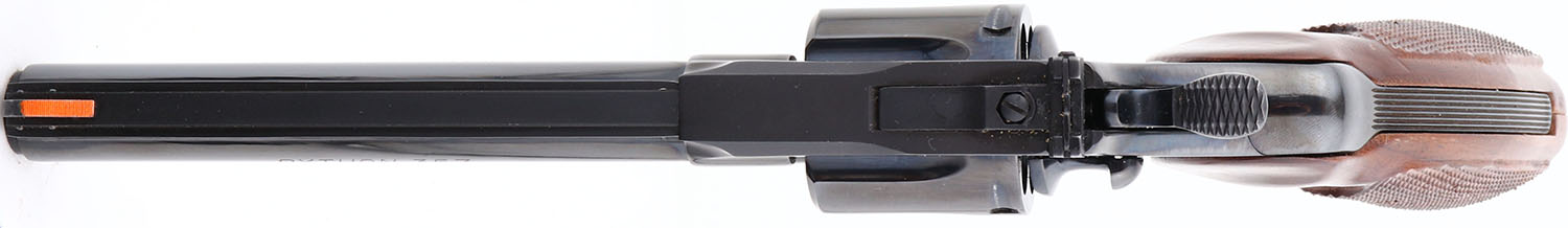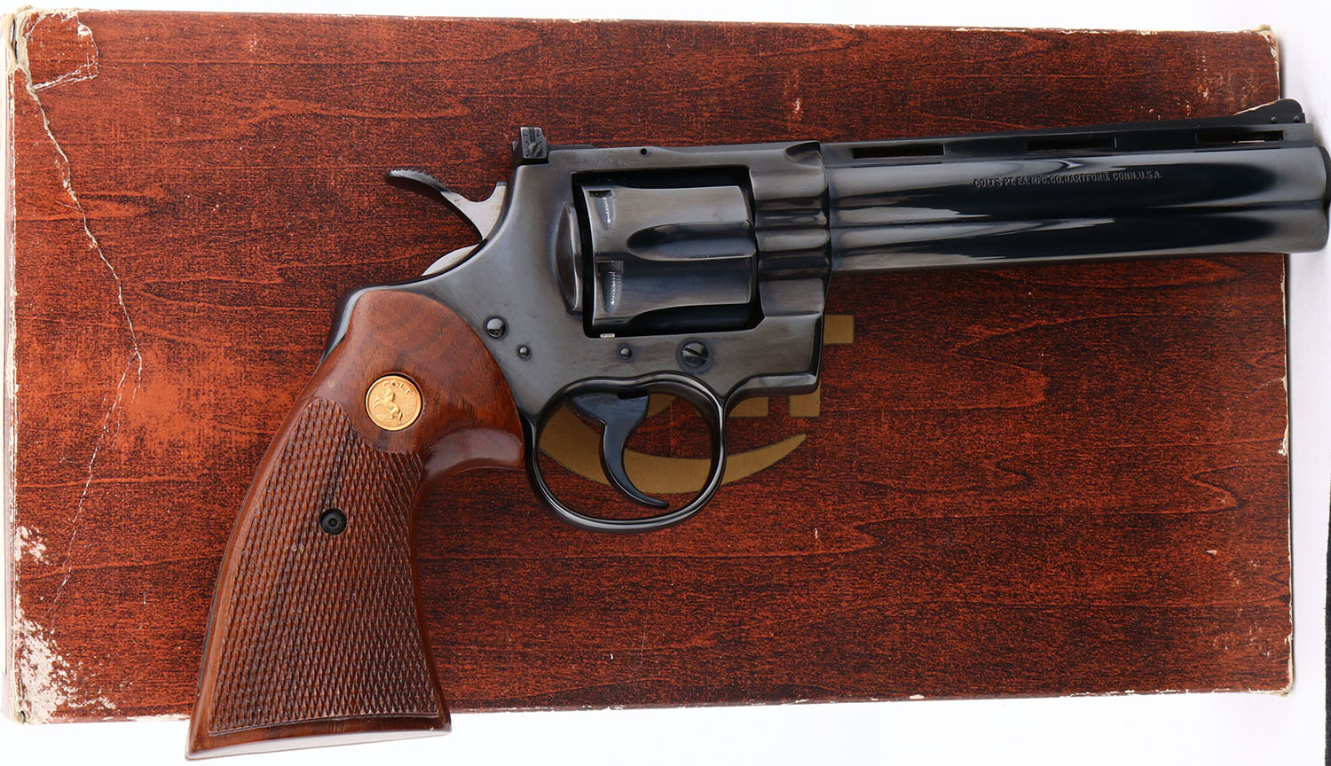 BOXED, Colt, Model Python, (I3660) CAL: .357 Magnum, MFG: 1975, SN: 11815E, Double Action Revolver, 6'' barrel. The Colt Python was introduced as a premium model in 1955, in caliber .357 Magnum. The Python is built on the large I-frame & has a reputation for accuracy, smooth trigger pull, & a tight cylinder lock-up. It has a 6-shot swing-out cylinder & was available in Python blue, Royal blue, Python nickel & Python stainless steel finishes. Some firearm collectors & writers have described the Python as ''the finest production revolver ever made''. It has a wide serrated target hammer, ventilated rib, & fully adjustable target quality rear sights. The left side of barrel is stamped ''PYTHON 357 * .357 MAGNUM CTG * ''. The Rampant Colt gold medallion, checkered walnut grips on this example are mint. The high polish blued finish is near mint. Bore is mint. The satin finished top of the ventilated rib barrel holds a screw height adjusting ''U'' notch rear sight & front blade sight. This gun comes in its original Colt wood grain box, with instruction manuals, hang tag, & screw driver tool coin. Consignor is the original purchaser & claims the revolver was never shot outside the factory test. Basically NOS, & very collectible when found in this condition. FFL Req. - Value: 2500 to 3000