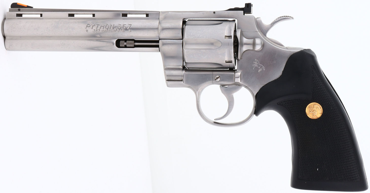 BOXED, Colt, Model Python, CAL: .357 Magnum, MFG: 1994, SN: PY9118, Double Action Revolver, 6'' barrel. The Colt Python was introduced as a premium model in 1955, in caliber .357 Magnum. The Python is built on the large I-frame & has a reputation for accuracy, smooth trigger pull, & a tight cylinder lock-up. It has a 6-shot swing-out cylinder & was available in Python blue, Royal blue, Python nickel & Python stainless steel finishes. Some firearm collectors & writers have described the Python as ''the finest production revolver ever made''. It has a wide serrated target hammer, ventilated rib, & fully adjustable target quality rear sights. The left side of barrel is stamped ''PYTHON 357 * .357 MAGNUM CTG * ''. The Rampant Colt gold medallion, checkered Pachmayr grips on this example are mint. The high satin stainless steel finish is excellent. Bore is mint. The satin finished top of the ventilated rib barrel holds a screw height adjusting ''U'' notch rear sight & front blade sight, with serrated orange insert. This gun comes in a reproduction Colt wood grain box, with bag. Highly collectible stainless steel variation. FFL Req. - Value: 1500 to 2500