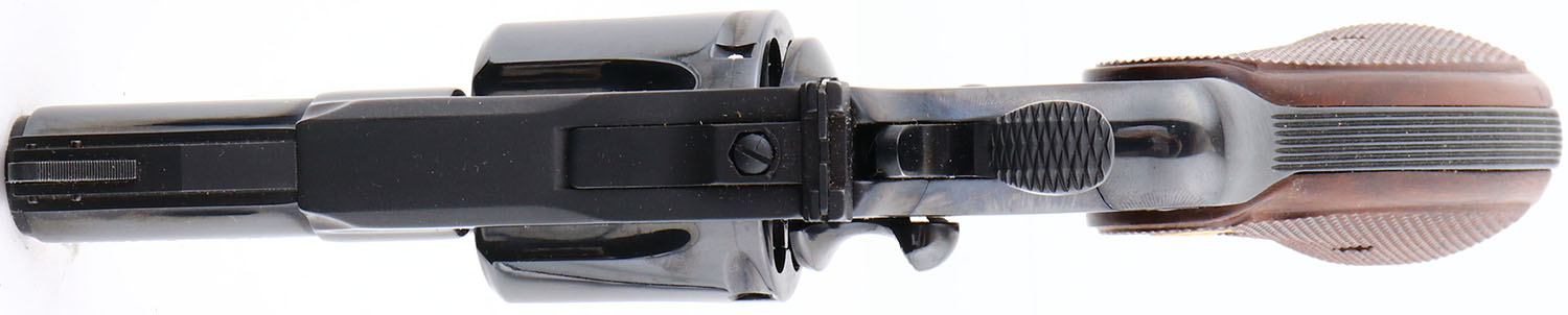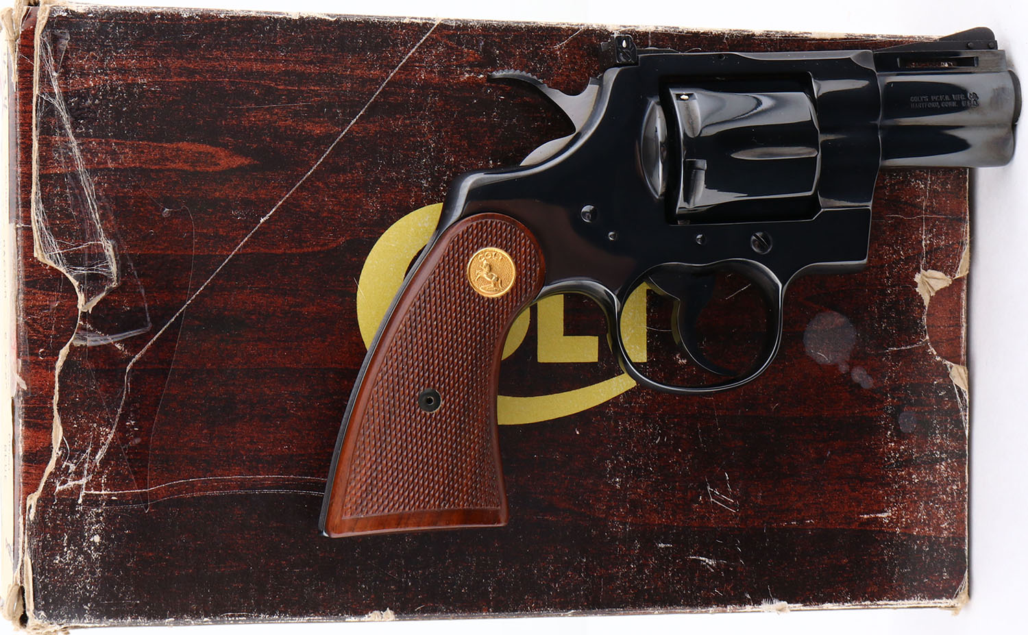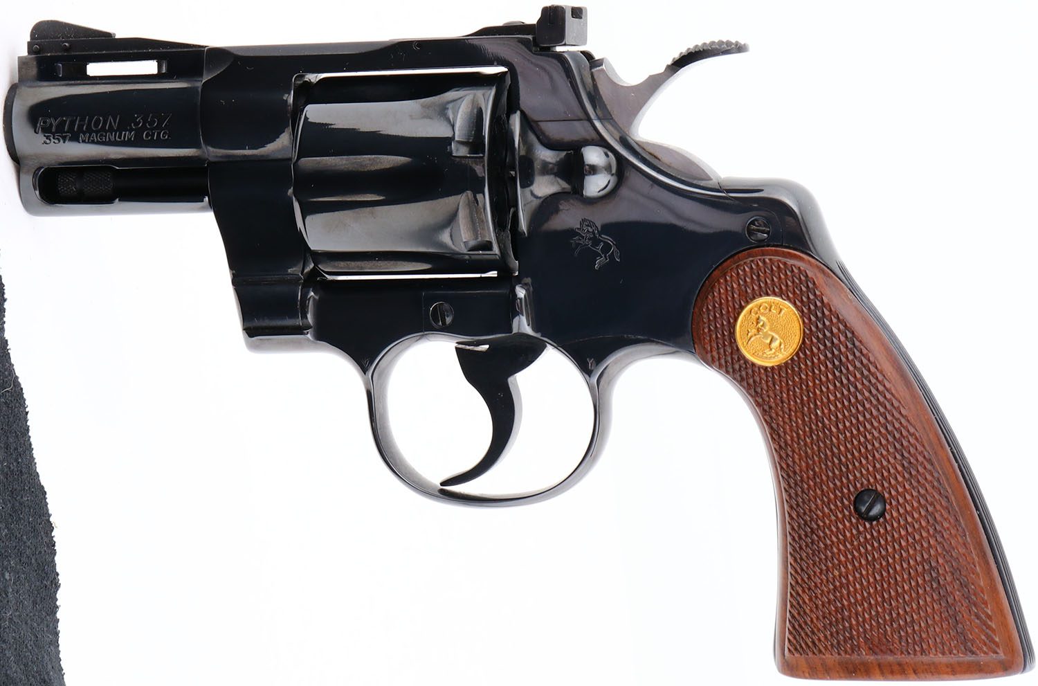 BOXED, Colt, Model Python, (I3620) CAL: .357 Magnum, MFG: 1984, SN: K84762, Double Action Revolver, 2 1/2'' barrel. The Colt Python was introduced as a premium model in 1955, in caliber .357 Magnum. The Python is built on the large I-frame & has a reputation for accuracy, smooth trigger pull, & a tight cylinder lock-up. It has a 6-shot swing-out cylinder & was available in Python blue, Royal blue, Python nickel & Python stainless steel finishes. Some firearm collectors & writers have described the Python as ''the finest production revolver ever made''. It has a wide serrated target hammer, ventilated rib, & fully adjustable target quality rear sights. The left side of barrel is stamped ''PYTHON 357 .357 MAGNUM CTG ''. The Rampant Colt gold medallion, checkered walnut grips on this example are mint. The high polish blued finish is near mint. Bore is mint. The satin finished top of the ventilated rib barrel holds a screw height adjusting ''U'' notch rear sight & front blade sight. This gun comes in its original Colt wood grain box, with instruction manual. Consignor's note claims the revolver was never shot outside the factory test. Still has factory grease on cylinder head so likely true. Basically NOS, & very collectible & desirable in the rarer 2 1/2'' variation. FFL Req. - Value: 3000 to 4000