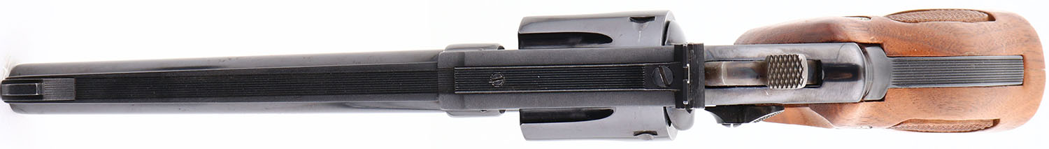 Smith & Wesson, Model 17-3, CAL: 22LR, MFG: 1975, SN: 8K29527, Double Action Revolver, 5 7/8'' barrel. The S&W brass logo medallion, checkered wood grips are excellent. There are minor dings & handling marks. The metal blue finish rates 99% overall. The hammer & trigger are case-hardened, retaining full case-colors. Bore is excellent. The frame holds an adjustable rear sight & elevated blade front sight. A high condition 17-3. FFL Req. - Value: 700 to 1200