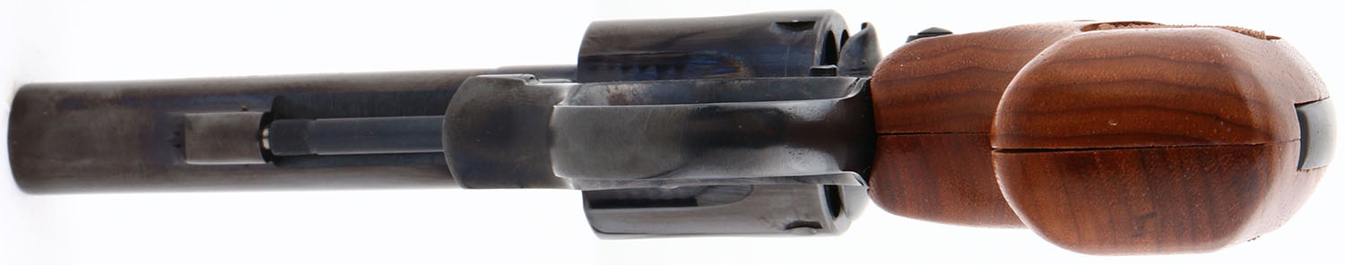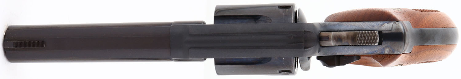 Smith & Wesson, Model 10-8, CAL: 38 S&W SPL, MFG: 1977, SN: D66407, Double Action Revolver, 4 1/4'' barrel. The S&W brass logo medallion, checkered wood grips are excellent. The metal blue finish rates 99% overall. The hammer & trigger are case-hardened, retaining full case-colors. Bore is excellent. The barrel holds a serrated blade front sight. FFL Req. - Value: 500 to 900