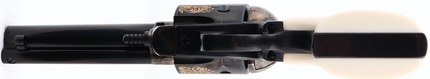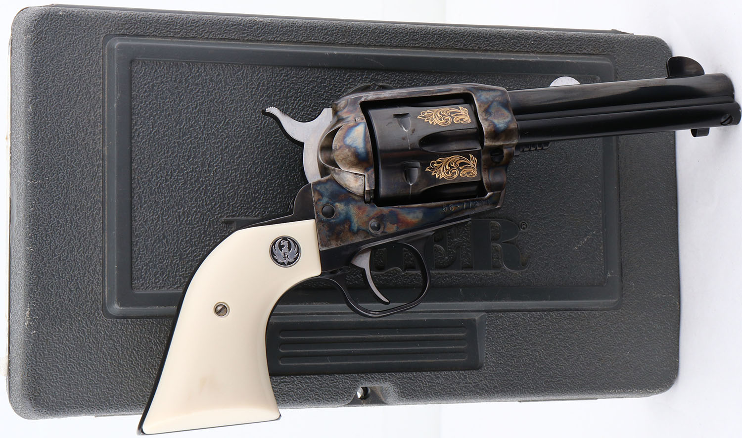 NEW, CASED, Ruger, Vaquero, CAL: 44 MAG, MFG: 1999, SN: 56-77268, Single Action Revolver, 4 5/8'' barrel. The Ruger logo faux ivory grips are excellent. The metal blue finish on the barrel, cylinder & trigger guard is excellent. The frame is case-hardened, retaining full case-colors. The floral engraving on the cylinder is gold tone, crisp & full. Bore is excellent. Barrel holds single front blade. Comes in original Ruger grey hard case, with owners manual, paperwork, lock & key. NOS. FFL Req. - Value: 700 to 1400
