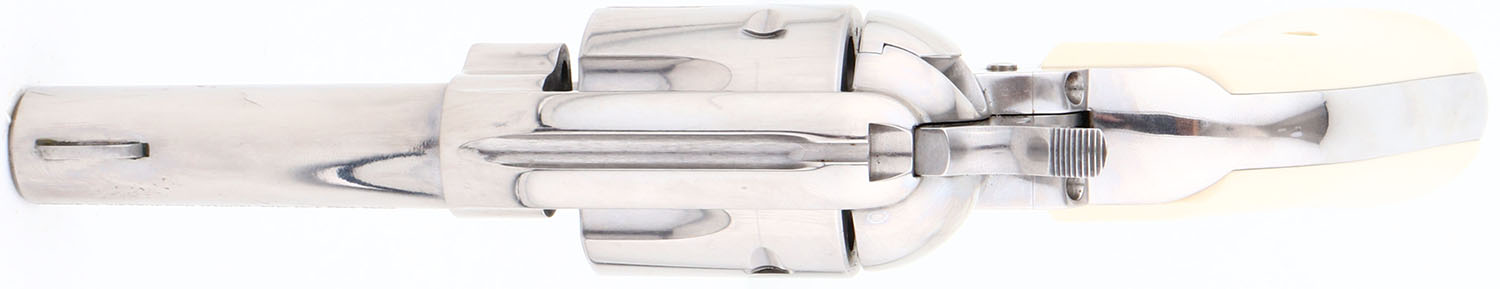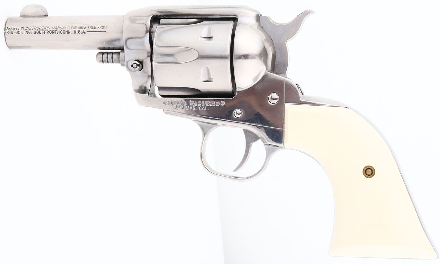 Ruger, Vaquero, CAL: 357 MAG, MFG: 1997, SN: 56-55240, Single Action Revolver, 3 1/2'' barrel. The faux ivory grips are excellent. The stainless steel finish is excellent, with numerous thin brush lines & some minor scuffs. Bore is excellent, with roughness amongst strong rifling. Barrel holds single front blade. Comes in a Ruger grey hard case, with no label. FFL Req. - Value: 500 to 1000