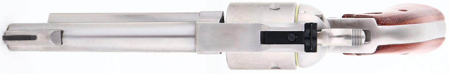 NEW, CASED, Ruger, New Model Super Blackhawk, CAL: 44 MAG, MFG: 2002, SN: 87-52772, Single Action Revolver, 4 3/4'' barrel. The Ruger logo medallion wood grips are excellent & minty. The polished stainless steel finish is excellent & mint. Bore is mint. Ruger Bisley Model floral roll stamped cylinder. Factory sights. Comes in original box with owners manual, paperwork, test fire cartridge, lock & key. NOS. FFL Req. - Value: 500 to 1000